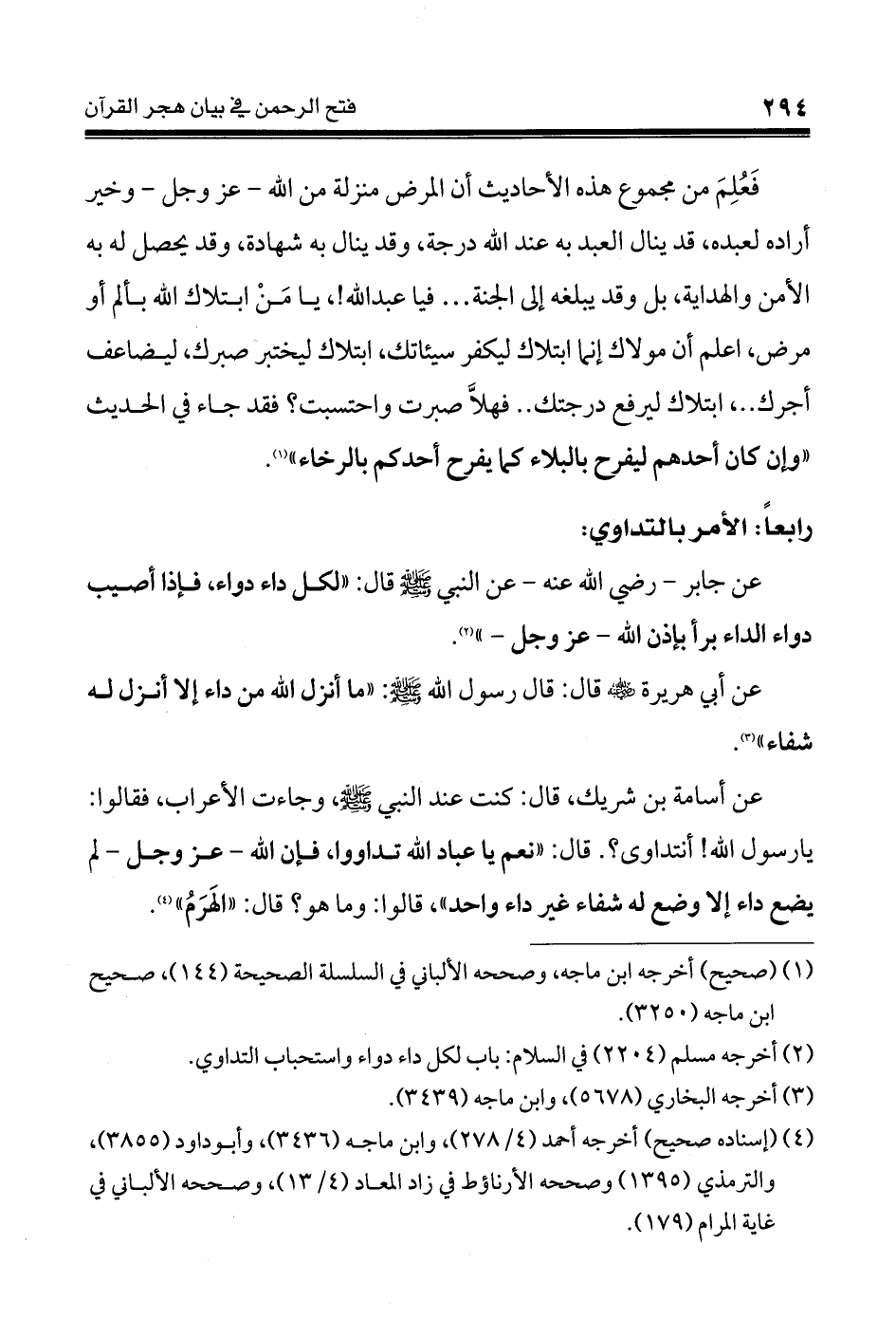 عن أسامة بن شريك، قال: كنت عند النبي - صلى الله عليه وسلم -، وجاءت الأعراب، فقالوا: يارسول الله! أنتداوى؟. قال: " نعم يا عباد الله تداووا، فإن الله - عز وجل - لم يضع داء إلا وضع له شفاء غير داء واحد "، قالوا: وما هو؟ قال: " الهَرَمُ " (¬4)