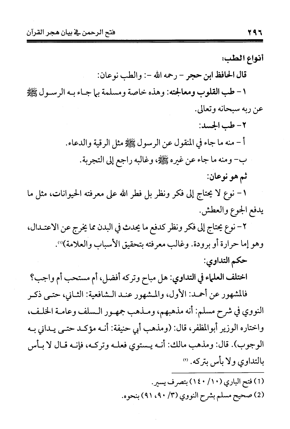 فالمشهور عن أحمد: الأول، والمشهور عند الشافعية: الثاني، حتى ذكر النووي في شرح مسلم: أنه مذهبهم، ومذهب جمهور السلف وعامة الخلف، واختاره الوزير أبوالمظفر، قال: (ومذهب أبي حنيفة: أنه مؤكد حتى يداني به الوجوب). قال: ومذهب مالك: أنه يستوي فعله وتركه، فإنه قال لا بأس بالتداوي ولا بأس بتركه. (¬2)