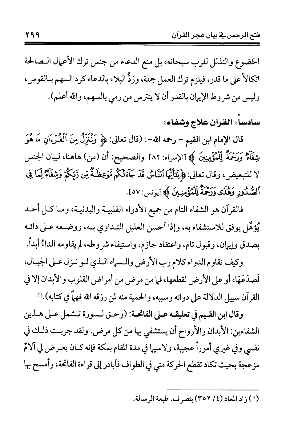 (قال تعالى: {وَنُنَزِّلُ مِنَ الْقُرْآنِ مَا هُوَ شِفَاء وَرَحْمَةٌ لِّلْمُؤْمِنِينَ} (82) سورة الإسراء والصحيح: أن (من) هاهنا، لبيان الجنس لا للتبعيض، وقال تعالى: {يَا أَيُّهَا النَّاسُ قَدْ جَاءتْكُم مَّوْعِظَةٌ مِّن رَّبِّكُمْ وَشِفَاء لِّمَا فِي الصُّدُورِ وَهُدًى وَرَحْمَةٌ لِّلْمُؤْمِنِينَ} (57) سورة يونس.