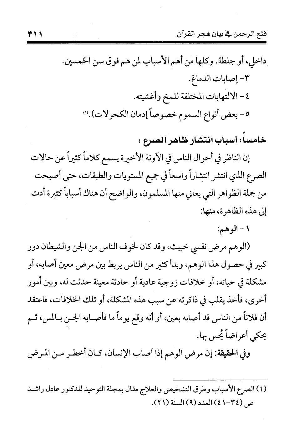 (الوهم مرض نفسي خبيث، وقد كان لخوف الناس من الجن والشيطان دور كبير في حصول هذا الوهم، وبدأ كثير من الناس يربط بين مرض معين أصابه، أو مشكلة في حياته، أو خلافات زوجية عادية أو حادثة معينة حدثت له، وبين أمور أخرى، فأخذ يقلب في ذاكرته عن سبب هذه المشكلة، أو تلك الخلافات، فاعتقد أن فلاناً من الناس قد أصابه بعين، أو أنه وقع يوماً ما فأصابه الجن بالمس، ثم يحكي أعراضاً يُحس بها.