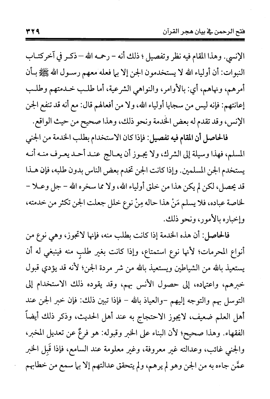 الإنسي. وهذا المقام فيه نظر وتفصيل؛ ذلك أنه - رحمه الله - ذكر في آخركتاب النبوات: أن أولياء الله لا يستخدمون الجن إلا بما فعله معهم رسول الله صلى الله عليه وسلم بأن أمرهم، ونهاهم، أي: بالأوامر، والنواهي الشرعية، أما طلب خدمتهم وطلب إعانتهم: فإنه ليس من سجايا أولياء الله، ولا من أفعالهم قال: مع أنه قد تنفع الجن الإنس، وقد تقدم له بعض الخدمة ونحو ذلك، وهذا صحيح من حيث الواقع.