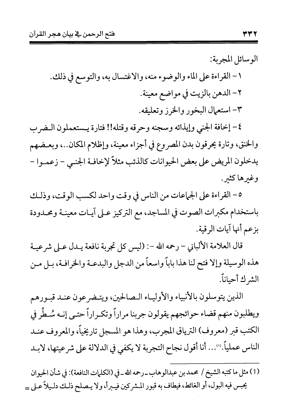 (¬1) مثل ما كتبه الشيخ / محمد بن عبد الوهاب - رحمه الله - في (الكلمات النافعة في شأن الحيوان يحبس فيه البول، أو الغائط، فيطاف به قبور المشركين فيبرأ، ولا يصلح ذلك دليلاً على صلاح صاحب القبر، إنما يفسره أهل العلم بأنهم يعذبون في قبورهم، فيسمع الحيوان صراخاً إذا اقترب من القبر فيرتاع لذلك، فتهتز أمعاؤه وأحشاؤه، فتطرد ما فيها، فيبرأ، لا دليل في ذلك على صلاح، بل هو دليل كفر وشرك وفساد) مجلة التوحيد ص (19).