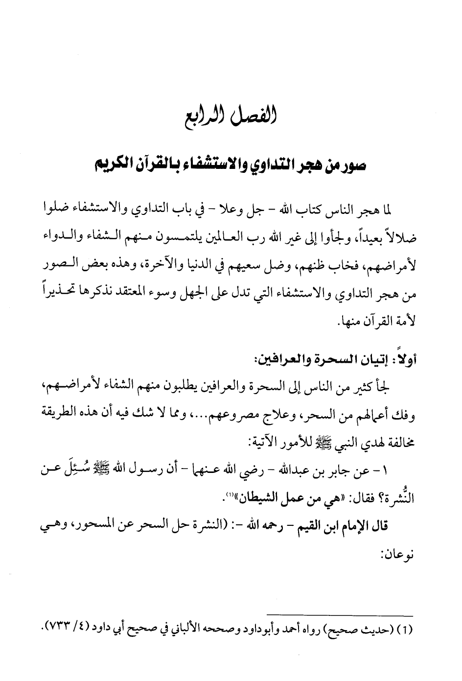 1 - عن جابر بن عبد الله - رضي الله عنهما - أن رسول الله - صلى الله عليه وسلم - سُئِلَ عن النُّشرة؟ فقال: " هي من عمل الشيطان " (¬1).