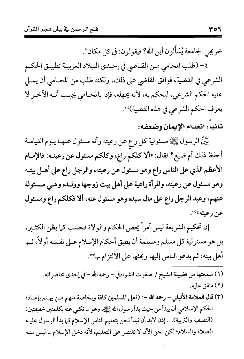 (¬3) قال العلامة الألباني - رحمه الله -: (فعلى المسلمين كافة وبخاصة منهم من يهتم بإعادة الحكم الإسلامي أن يبدأ من حيث بدأ رسول الله - صلى الله عليه وسلم -، وهو ما نكني عنه بكلمتين خفيفتين: (التصفية والتربية) ... إذن لابد أن نبدأ نحن بتعليم الناس الإسلام كما بدأ الرسول عليه الصلاة والسلام؛ لكن نحن الآن لا نقتصر على التعليم، لأنه دخل الإسلام ما ليس منه وما لا يمت إليه بصلة، بل دخل عليه ما كان سبباً في تهدم الصرح الإسلامي فلذلك كان من الواجب على الدعاة أن يبدؤوا بتصفية هذا الإسلام مما دخل فيه والشيء الثاني أن يقترن مع هذه التصفية تربية الشباب المسلم الناشئ على هذا الإسلام المصفى) مجلة السلفية ص (42) العدد (6) 1422 هـ.
