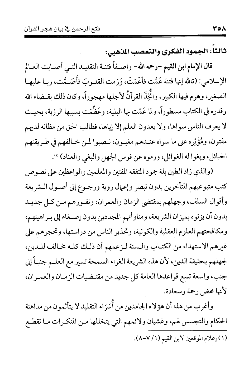 (والذي زاد الطين بلة جمود المتفقه المفتين والمعلمين والواعظين على نصوص كتب متبوعيهم المتأخرين بدون تبصر وإعمال روية ورجوع إلى أصول الشريعة وأقوال السلف، وجهلهم بمقتضى الزمان والعمران، ونفورهم من كل جديد بدون أن يزنوه بميزان الشريعة، ومناوأتهم المجددين بدون إصغاء إلى براهينهم، ومكافحتهم العلوم العقلية والكونية، وتحذير الناس من دراستها، وتحجرهم على غيرهم الاستهداء من الكتاب والسنة لزعمهم أن ذلك كله مخالف للدين، لجهلهم بحقيقة الدين، لأن هذه الشريعة الغراء السمحة تسير مع العلم جنباً إلى جنب، واسعة تسع قواعدها العامة كل جديد من مقتضيات الزمان والعمران، لأنها محض رحمة وسعادة.