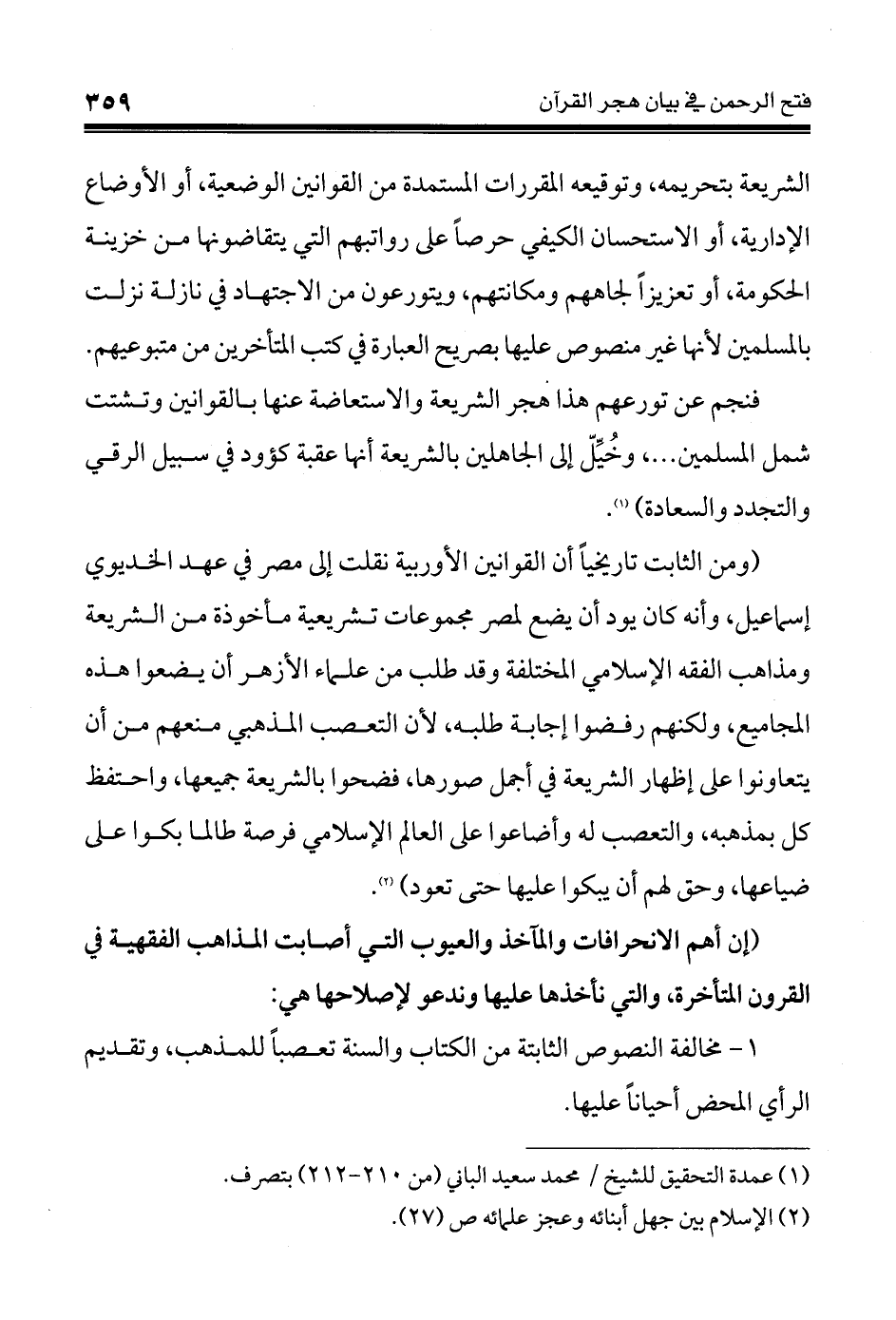 فنجم عن تورعهم هذا هجر الشريعة والاستعاضة عنها بالقوانين وتشتت شمل المسلمين ... ، وخُيِّلّ إلى الجاهلين بالشريعة أنها عقبة كؤود في سبيل الرقي والتجدد والسعادة) (¬1).