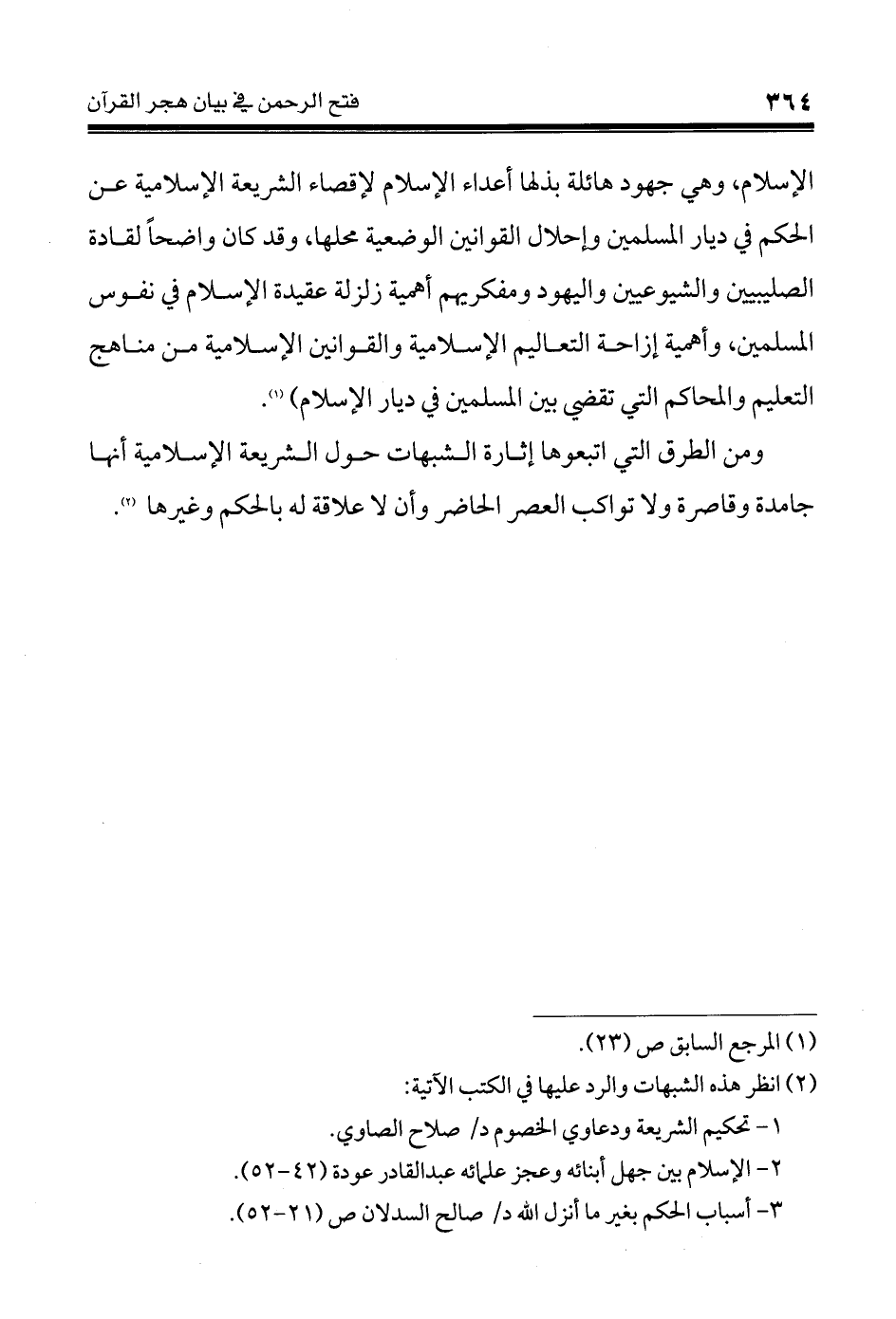 الإسلام، وهي جهود هائلة بذلها أعداء الإسلام لإقصاء الشريعة الإسلامية عن الحكم في ديار المسلمين وإحلال القوانين الوضعية محلها، وقد كان واضحاً لقادة الصليبيين والشيوعيين واليهود ومفكريهم أهمية زلزلة عقيدة الإسلام في نفوس المسلمين، وأهمية إزاحة التعاليم الإسلامية والقوانين الإسلامية من مناهج التعليم والمحاكم التي تقضي بين المسلمين في ديار الإسلام) (¬1).