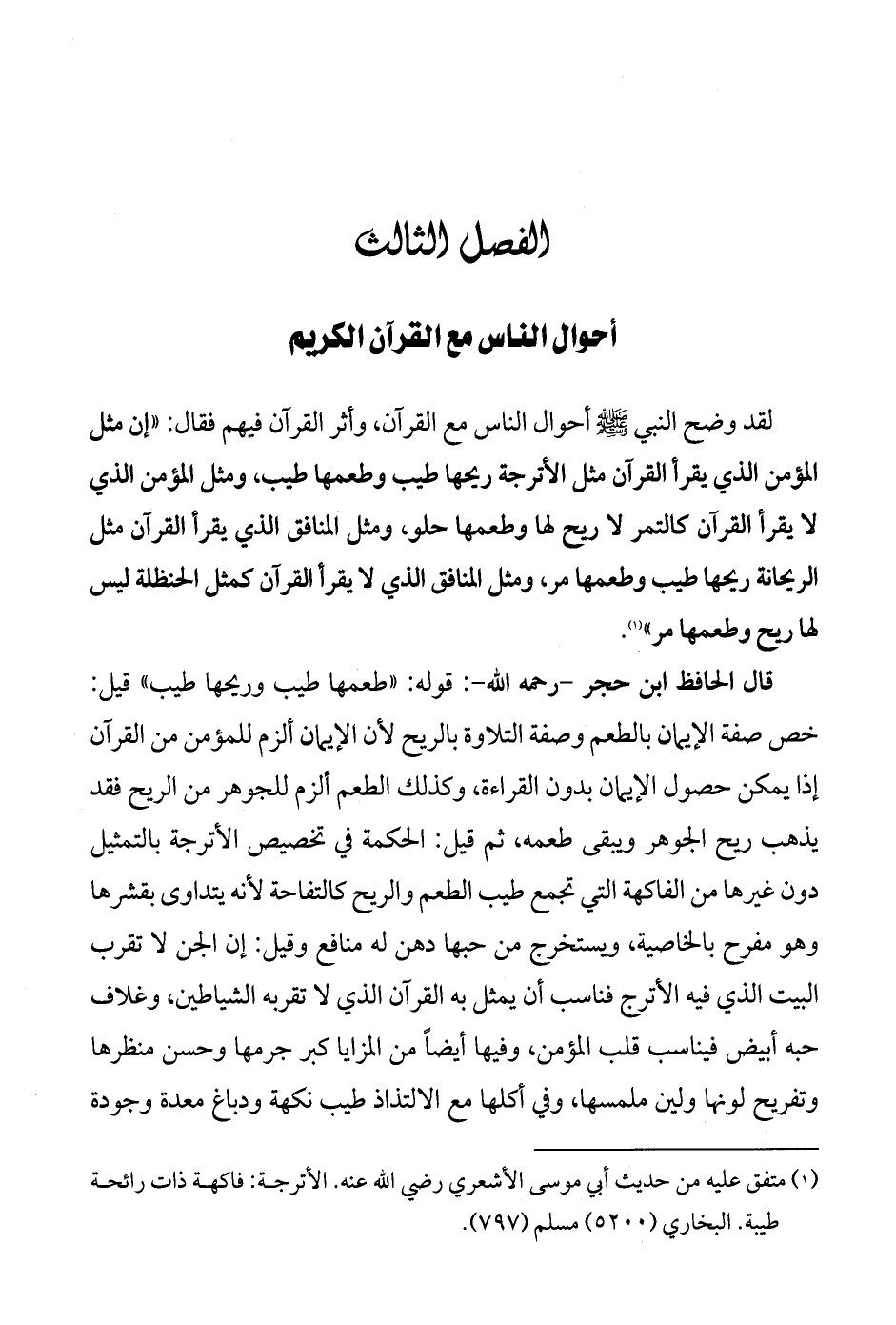 لقد وضح النبي - صلى الله عليه وسلم - أحوال الناس مع القرآن، وأثر القرآن فيهم فقال: " إن مثل المؤمن الذي يقرأ القرآن مثل الأترجة ريحها طيب وطعمها طيب، ومثل المؤمن الذي لا يقرأ القرآن كالتمر لا ريح لها وطعمها حلو، ومثل المنافق الذي يقرأ القرآن مثل الريحانة ريحها طيب وطعمها مر، ومثل المنافق الذي لا يقرأ القرآن كمثل الحنظلة ليس لها ريح وطعمها مر " (¬1).