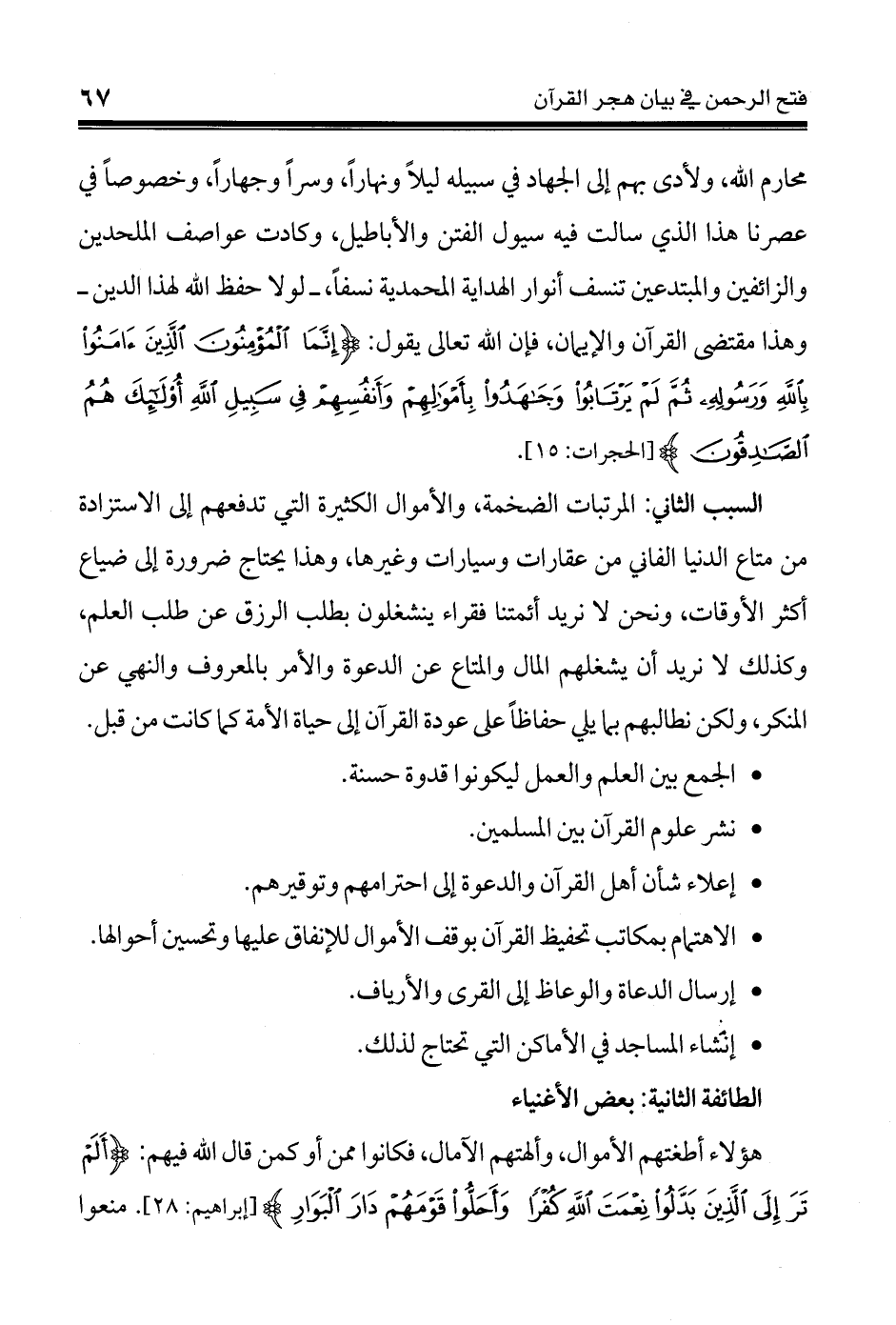 محارم الله، ولأدى بهم إلى الجهاد في سبيله ليلاً ونهاراً، وسراً وجهاراً، وخصوصاً في عصرنا هذا الذي سالت فيه سيول الفتن والأباطيل، وكادت عواصف الملحدين والزائفين والمبتدعين تنسف أنوار الهداية المحمدية نسفاً، - لولا حفظ الله لهذا الدين - وهذا مقتضى القرآن والإيمان، فإن الله تعالى يقول: {إِنَّمَا الْمُؤْمِنُونَ الَّذِينَ آمَنُوا بِاللَّهِ وَرَسُولِهِ ثُمَّ لَمْ يَرْتَابُوا وَجَاهَدُوا بِأَمْوَالِهِمْ وَأَنفُسِهِمْ فِي سَبِيلِ اللَّهِ أُوْلَئِكَ هُمُ الصَّادِقُونَ} (15) سورة الحجرات.