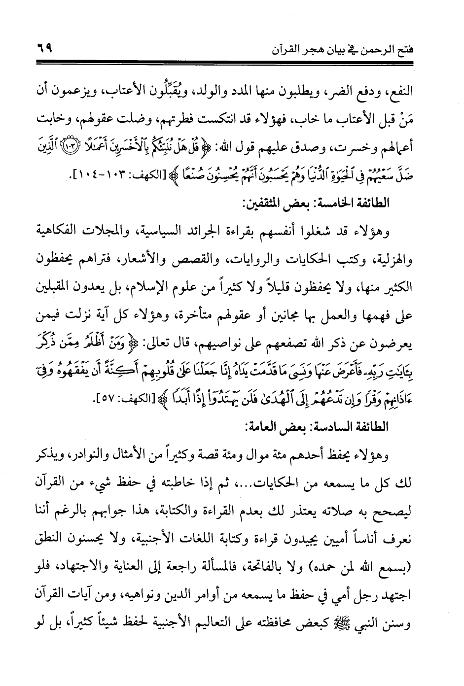 وهؤلاء قد شغلوا أنفسهم بقراءة الجرائد السياسية، والمجلات الفكاهية والهزلية، وكتب الحكايات والروايات، والقصص والأشعار، فتراهم يحفظون الكثير منها، ولا يحفظون قليلاً ولا كثيراً من علوم الإسلام، بل يعدون المقبلين على فهمها والعمل بها مجانين أو عقولهم متأخرة، وهؤلاء كل آية نزلت فيمن يعرضون عن ذكر الله تصفعهم على نواصيهم، قال تعالى: {وَمَنْ أَظْلَمُ مِمَّن ذُكِّرَ بِآيَاتِ رَبِّهِ فَأَعْرَضَ عَنْهَا وَنَسِيَ مَا قَدَّمَتْ يَدَاهُ إِنَّا جَعَلْنَا عَلَى قُلُوبِهِمْ أَكِنَّةً أَن يَفْقَهُوهُ وَفِي آذَانِهِمْ وَقْرًا وَإِن تَدْعُهُمْ إِلَى الْهُدَى فَلَن يَهْتَدُوا إِذًا أَبَدًا} (57) سورة الكهف.