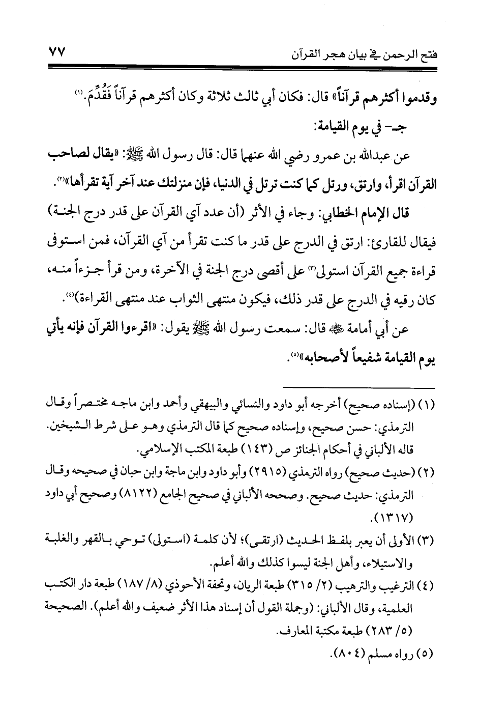 عن عبد الله بن عمرو - رضي الله عنهما - قال: قال رسول الله - صلى الله عليه وسلم -: «يقال لصاحب القرآن اقرأ، وارتق، ورتل كما كنت ترتل في الدنيا، فإن منزلتك عند آخر آية تقرأها» (¬2).