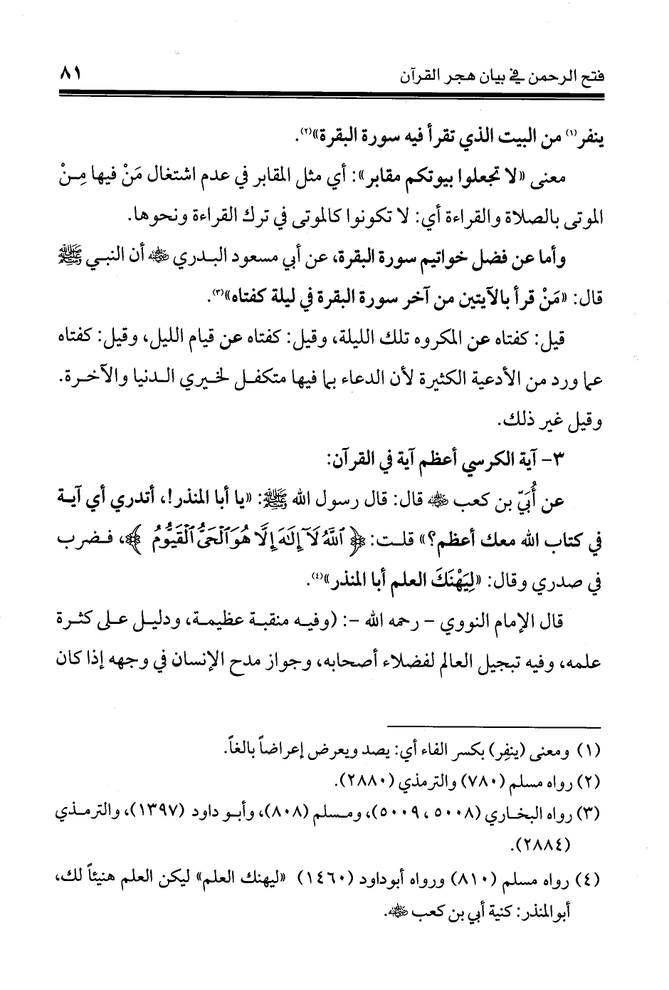 عن أُبَيّ بن كعب - رضي الله عنه - قال: قال رسول الله - صلى الله عليه وسلم -: " يا أبا المنذر!، أتدري أي آية في كتاب الله معك أعظم؟ " قلت: {اللهُ لاَ إِلَهَ إِلاَّ هُوَ الْحَيُّ الْقَيُّومُ}، فضرب في صدري وقال: " لِيَهْنَكَ العلم أباالمنذر " (¬4).