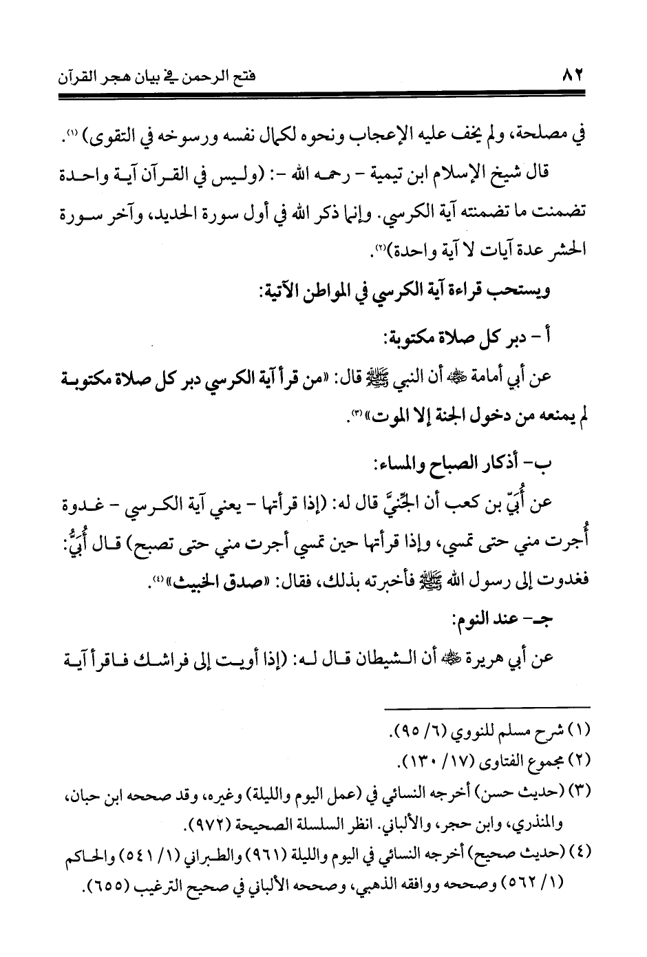 عن أبي أمامة - رضي الله عنه - أن النبي - صلى الله عليه وسلم - قال: " من قرأ آية الكرسي دبر كل صلاة مكتوبة لم يمنعه من دخول الجنة إلا الموت " (¬3).