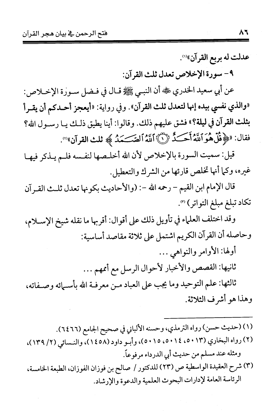 قال الإمام ابن القيم - رحمه الله -: (والأحاديث بكونها تعدل ثلث القرآن تكاد تبلغ مبلغ التواتر) (¬3).
