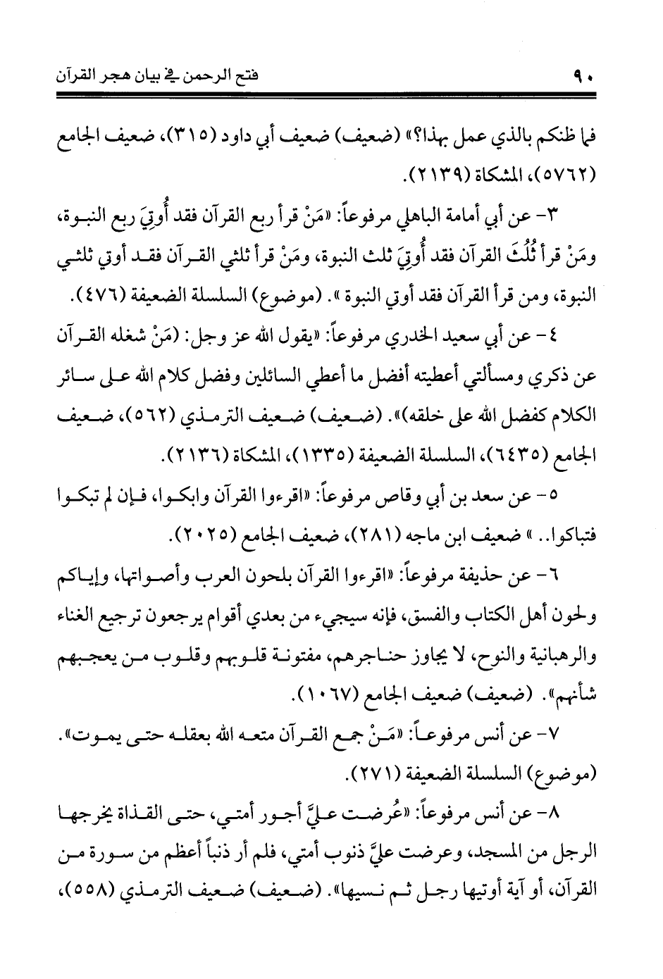 8 - عن أنس مرفوعاً: «عُرضت عليَّ أجور أمتي، حتى القذاة يخرجها الرجل من المسجد، وعرضت عليَّ ذنوب أمتي، فلم أر ذنباً أعظم من سورة من القرآن، أو آية أوتيها رجل ثم نسيها». (ضعيف) ضعيف الترمذي (558)،