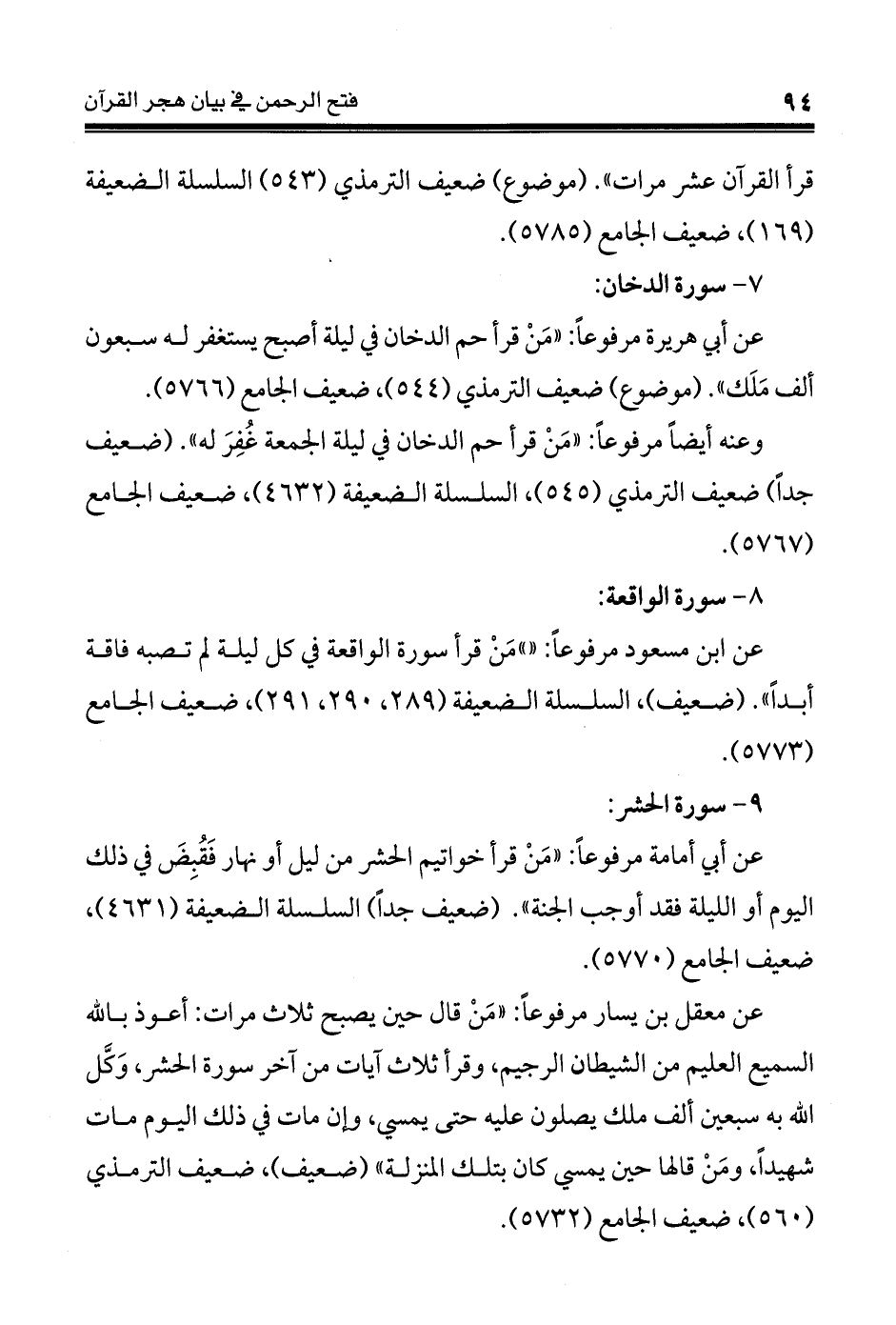 قرأ القرآن عشر مرات". (موضوع) ضعيف الترمذي (543) السلسلة الضعيفة (169)، ضعيف الجامع (5785).