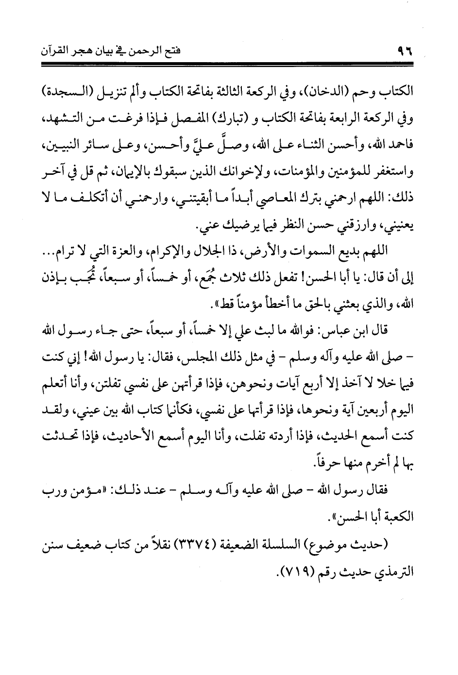 الكتاب وحم (الدخان)، وفي الركعة الثالثة بفاتحة الكتاب وألم تنزيل (السجدة) وفي الركعة الرابعة بفاتحة الكتاب و (تبارك) المفصل فإذا فرغت من التشهد، فاحمد الله، وأحسن الثناء على الله، وصلَّ عليَّ وأحسن، وعلى سائر النبيين، واستغفر للمؤمنين والمؤمنات، ولإخوانك الذين سبقوك بالإيمان، ثم قل في آخر ذلك: