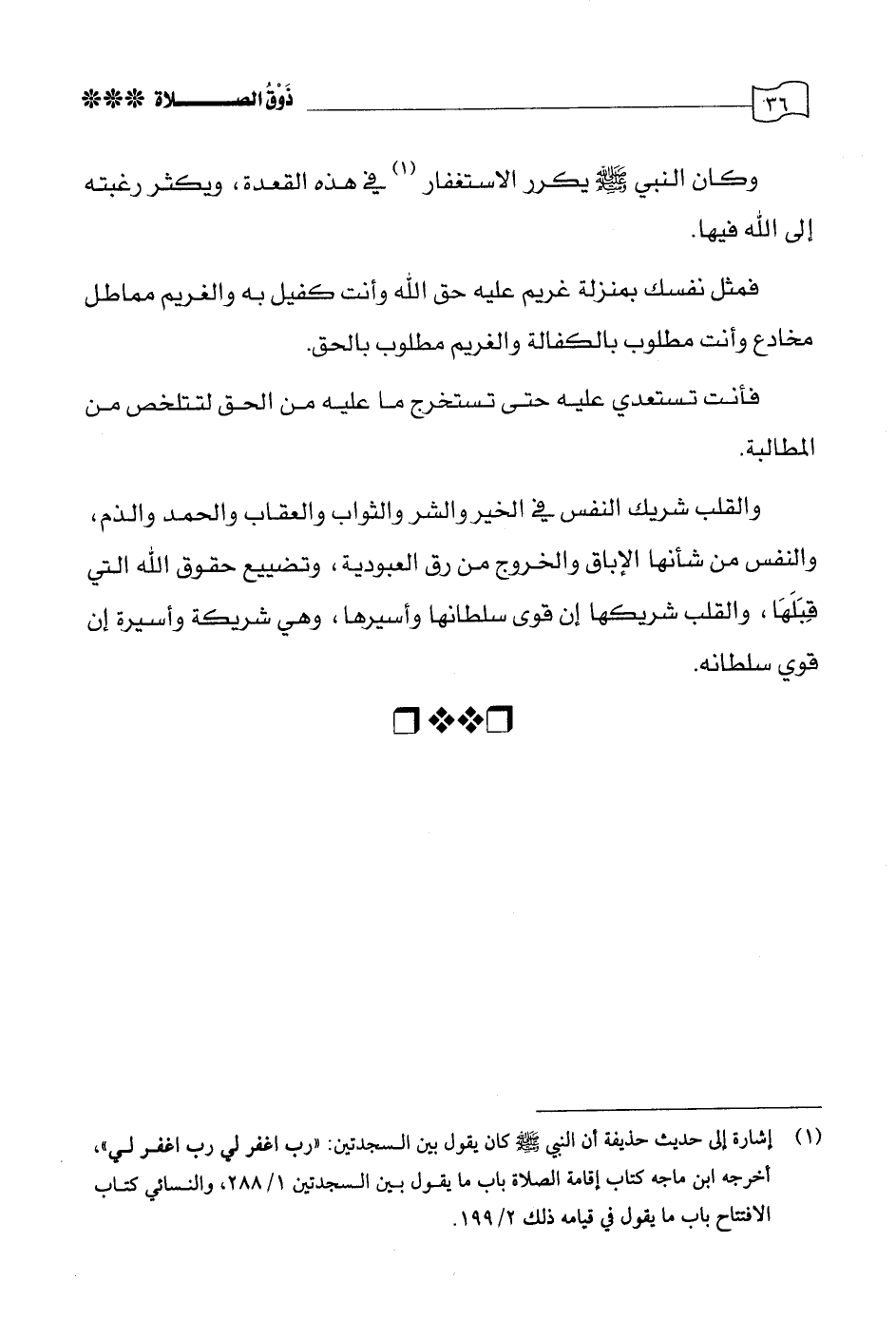 (¬1) إشارة إلى حديث حذيفة أن النبي - صلى الله عليه وسلم - كان يقول بين السجدتين: «رب اغفر لي رب اغفر لي» أخرجه ابن ماجه كتاب إقامة الصلاة باب ما يقول بين السجدتين (1/ 288) والنسائي كتاب الافتتاح باب ما يقول في قيامه ذلك (2/ 199).