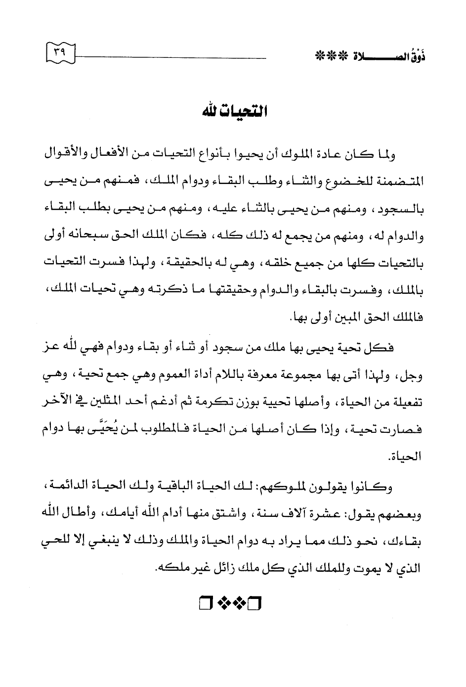 ولما كان عادة الملوك أن يحيوا بأنواع التحيات من الأفعال والأقوال المتضمنة للخضوع والثناء وطلب البقاء ودوام الملك، فمنهم من يحيى بالسجود ومنهم من يحيى بالثناء عليه، ومنهم من يحيى بطلب البقاء والدوام له، ومنهم من يجمع له ذلك كله، فكان الملك الحق سبحانه أولى بالتحيات كلها من جميع خلقه، وهي له بالحقيقة، ولهذا فسرت التحيات بالملك، وفسرت بالبقاء والدوام وحقيقتها ما ذكرته وهي تحيات الملك، فالملك الحق المبين أولى بها.