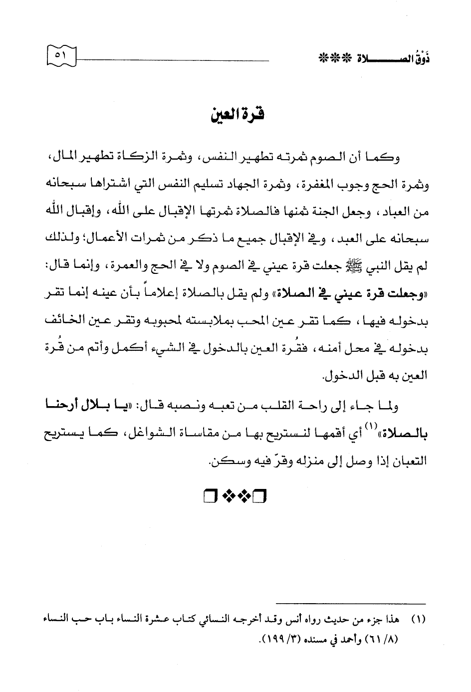 وكما أن الصوم ثمرته تطهير النفس، وثمرة الزكاة تطهير المال، وثمرة الحج وجوب المغفرة، وثمرة الجهاد تسليم النفس التي اشتراها سبحانه من العباد، وجعل الجنة ثمنها فالصلاة ثمرتها الإقبال على الله، وإقبال الله سبحانه على العبد، وفي الإقبال جميع ما ذكر من ثمرات الأعمال؛ ولذلك لم يقل النبي - صلى الله عليه وسلم - جعلت قرة عيني في الصوم ولا في الحج والعمرة، وإنما قال: «وجعلت قرة عيني في الصلاة» ولم يقل بالصلاة إعلامًا بأن عينه إنما تقر بدخوله فيها، كما تقر عين المحب بملابسته لمحبوبه وتقر عين الخائف بدخوله في محل أمنه، فقرة العين بالدخول في الشيء أكمل وأتم من قُرة العين به قبل الدخول.