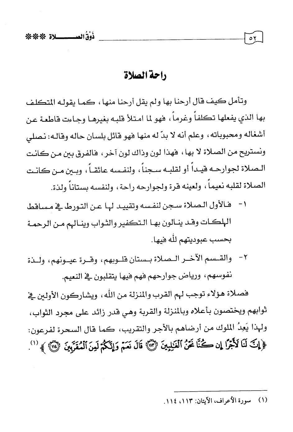 2 - والقسم الآخر الصلاة بستان قلوبهم، وقرة عيونهم، ولذة نفوسهم، ورياض جوارحهم فهم فيها يتقلبون في النعيم.