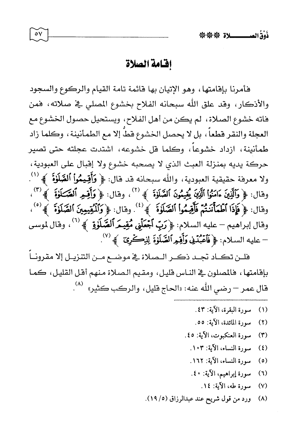 فلن تكاد تجد ذكر الصلاة في موضع من التنزيل إلا مقرونًا بإقامتها فالمصلون في الناس قليل، ومقيم الصلاة منهم أقل القليل، كما قال عمر رضي الله عنه: «الحاج قليل، والركب كثير» (¬1).