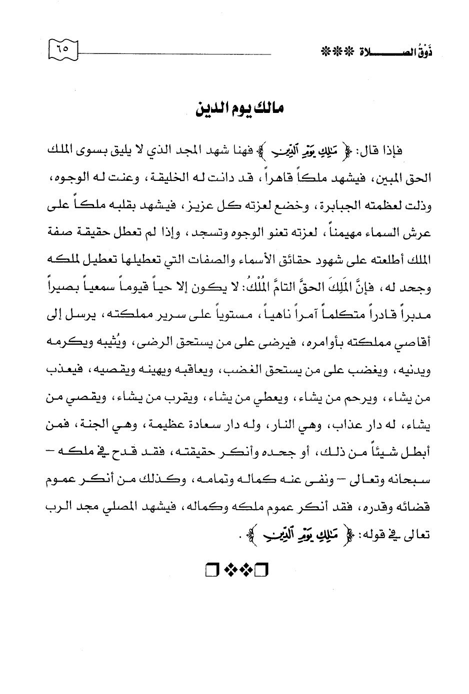 فإذا قال: {مَالِكِ يَوْمِ الدِّينِ} فهنا شهد المجد الذي لا يليق بسوى الملك الحق المبين فيشهد ملكًا قاهرًا قد دانت له الخليقة وعنت له الوجوه، وذلت لعظمته الجبابرة، وخضع لعزته كل عزيز، فيشهد بقلبه ملكًا على عرش السماء مهيمنًا لعزته تعنو الوجوه وتسجد وإذا لم تعطل حقيقة صفة الملك أطلعته على شهود حقائق الأسماء والصفات التي تعطيلها تعطيل لملكه وجحد له, فإن الملك الحق التام الملك: لا يكون إلا حيا قيومًا سميعًا بصيرًا مدبرًا قادرًا متكلمًا آمرًا ناهيًا مستويًا على سرير مملكته، يرسل إلى أقاصي مملكته بأوامره، فيرضى على من يستحق الرضا، ويثيبه ويكرمه ويدنيه ويغضب على من يستحق الغضب ويعاقبه ويهينه ويقصيه فيعذب من يشاء ويرحم من يشاء ويعطي من يشاء، ويقرب من يشاء، ويقصي من يشاء، له دار عذاب، وهي النار، وله دار سعادة عظيمة، وهي الجنة فمن أبطل شيئَا من ذلك، أو جحده وأنكر حقيقته فقد قدح في ملكه سبحانه وتعالى- ونفى عنه كماله وتمامه، وكذلك من أنكر عموم قضائه وقدره فقد أنكر عموم ملكه وكماله، فيشهد المصلي مجد الرب تعالى في قوله: {مَالِكِ يَوْمِ الدِّينِ}.