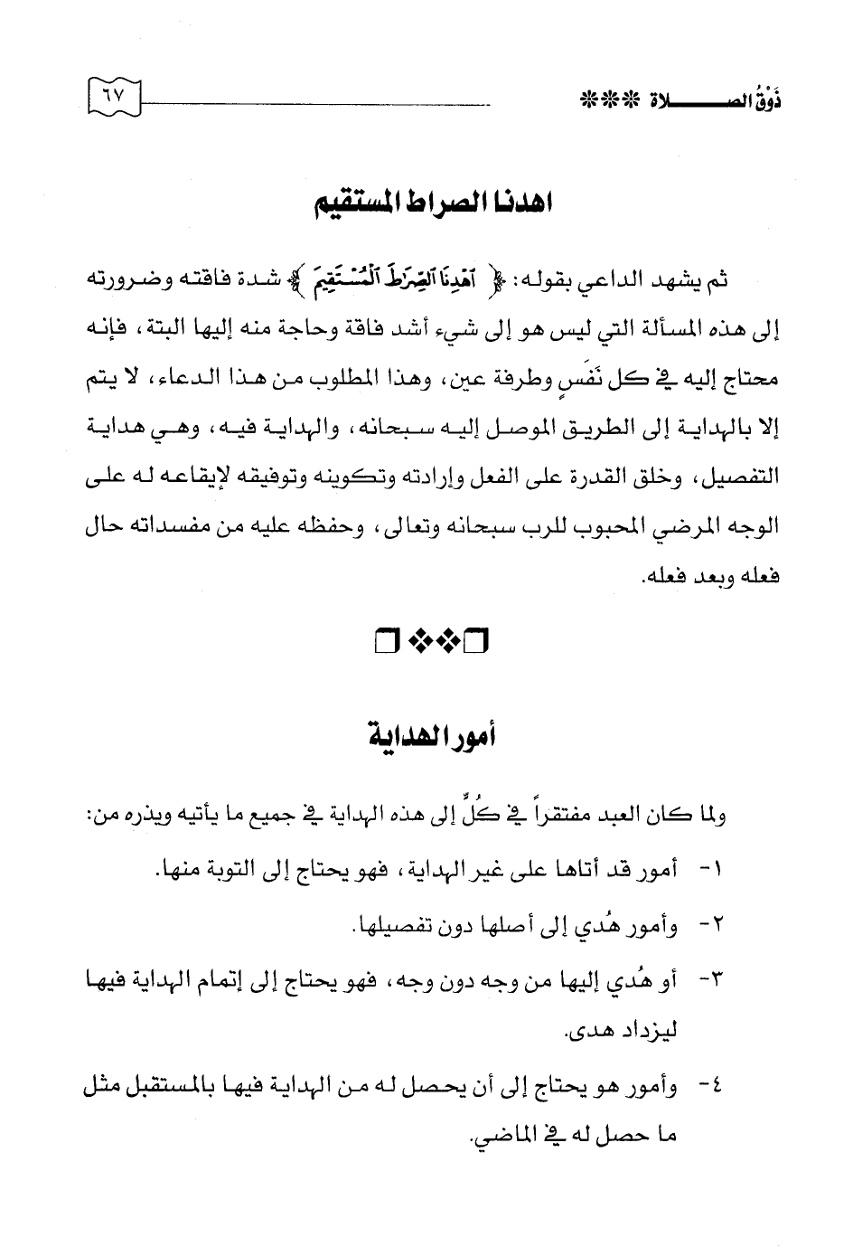ثم يشهد الداعي بقوله: {اهْدِنَا الصِّرَاطَ الْمُسْتَقِيمَ} شدة فاقته وضرورته إلى هذه المسألة التي ليس هو إلى شيء أشد فاقة وحاجة منه إليها البتة، فإنه محتاج إليه في كل نفس وطرفة عين، وهذا المطلوب من هذا الدعاء لا يتم إلا بالهداية إلى الطريق الموصل إليه سبحانه، والهداية فيه وهي هداية التفصيل وخلق القدرة على الفعل وإرادته وتكوينه وتوفيقه لإيقاعه له على الوجه المرضي المحبوب للرب سبحانه وتعالى، وحفظه عليه من مفسداته حال فعله وبعد فعله.