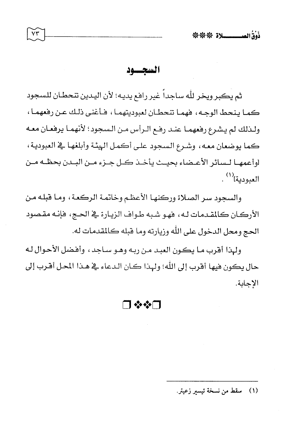 والسجود سر الصلاة وركنها الأعظم وخاتمة الركعة، وما قبله من الأركان كالمقدمات له، فهو شبه طواف الزيارة في الحج، فإنه مقصود الحج ومحل الدخول على الله وزيارته وما قبله كالمقدمات له.
