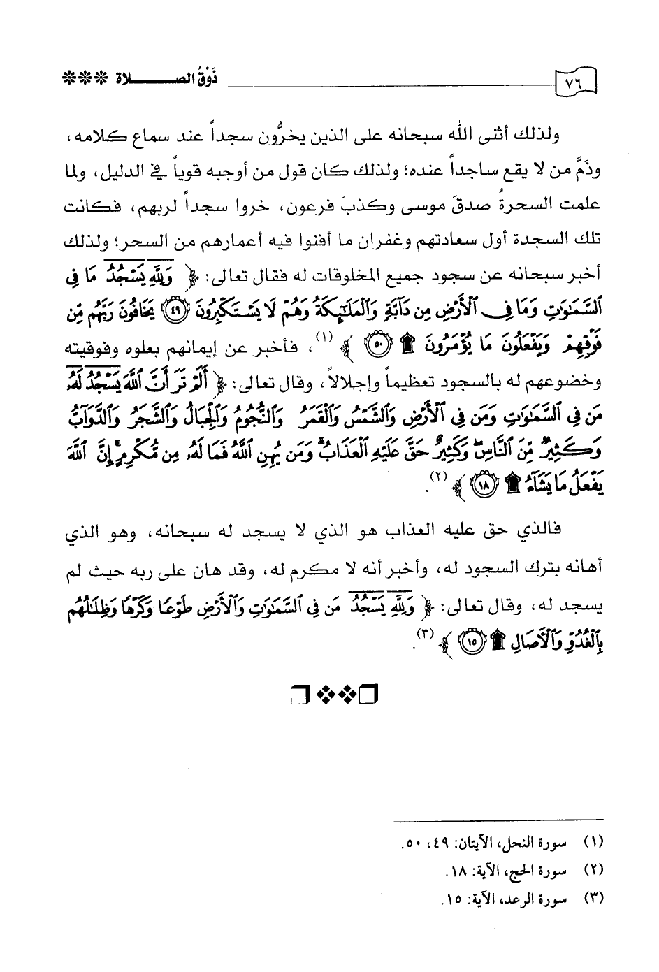 ولذلك أثنى الله سبحانه على الذين يخرون سجدًا عند سماع كلامه، وذم من لا يقع ساجدًا عنده؛ ولذلك كان قول من أوجبه قويًا في الدليل ولما علمت السحرة صدق موسى وكذب فرعون، خروا سجدًا لربهم، فكانت تلك السجدة أول سعادتهم وغفران ما أفنوا فيه أعمارهم من السحر؛ ولذلك أخبر سبحانه عن سجود جميع المخلوقات له فقال تعالى: {وَلِلَّهِ يَسْجُدُ مَا فِي السَّمَاوَاتِ وَمَا فِي الْأَرْضِ مِنْ دَابَّةٍ وَالْمَلَائِكَةُ وَهُمْ لَا يَسْتَكْبِرُونَ * يَخَافُونَ رَبَّهُمْ مِنْ فَوْقِهِمْ وَيَفْعَلُونَ مَا يُؤْمَرُونَ} [النحل: 49، 50] فأخبر عن إيمانهم بعلوه وفوقيته وخضوعهم له بالسجود تعظيمًا وإجلالاً وقال تعالى: {أَلَمْ تَرَ أَنَّ اللَّهَ يَسْجُدُ لَهُ مَنْ فِي السَّمَاوَاتِ وَمَنْ فِي الْأَرْضِ وَالشَّمْسُ وَالْقَمَرُ وَالنُّجُومُ وَالْجِبَالُ وَالشَّجَرُ وَالدَّوَابُّ وَكَثِيرٌ مِنَ النَّاسِ وَكَثِيرٌ حَقَّ عَلَيْهِ الْعَذَابُ وَمَنْ يُهِنِ اللَّهُ فَمَا لَهُ مِنْ مُكْرِمٍ إِنَّ اللَّهَ يَفْعَلُ مَا يَشَاءُ} [الحج: 18].
