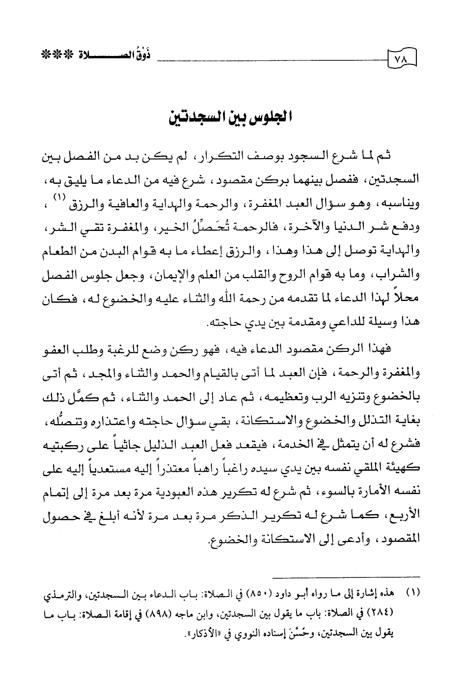 (¬1) هذه إشارة إلى ما رواه أبو داود (850) في الصلاة: باب الدعاء بين السجدتين، والترمذي (284) في الصلاة: باب ما يقول بين السجدتين: وابن ماجه (898) في إقامة الصلاة: باب ما يقول بين السجدتين، وحسن إسناده النووي في «الأذكار».