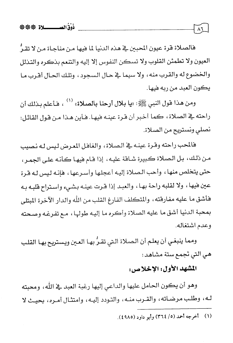 ومما ينبغي أن يعلم أن الصلاة التي تقر بها العين ويستريح بها القلب هي التي تجمع ستة مشاهد: