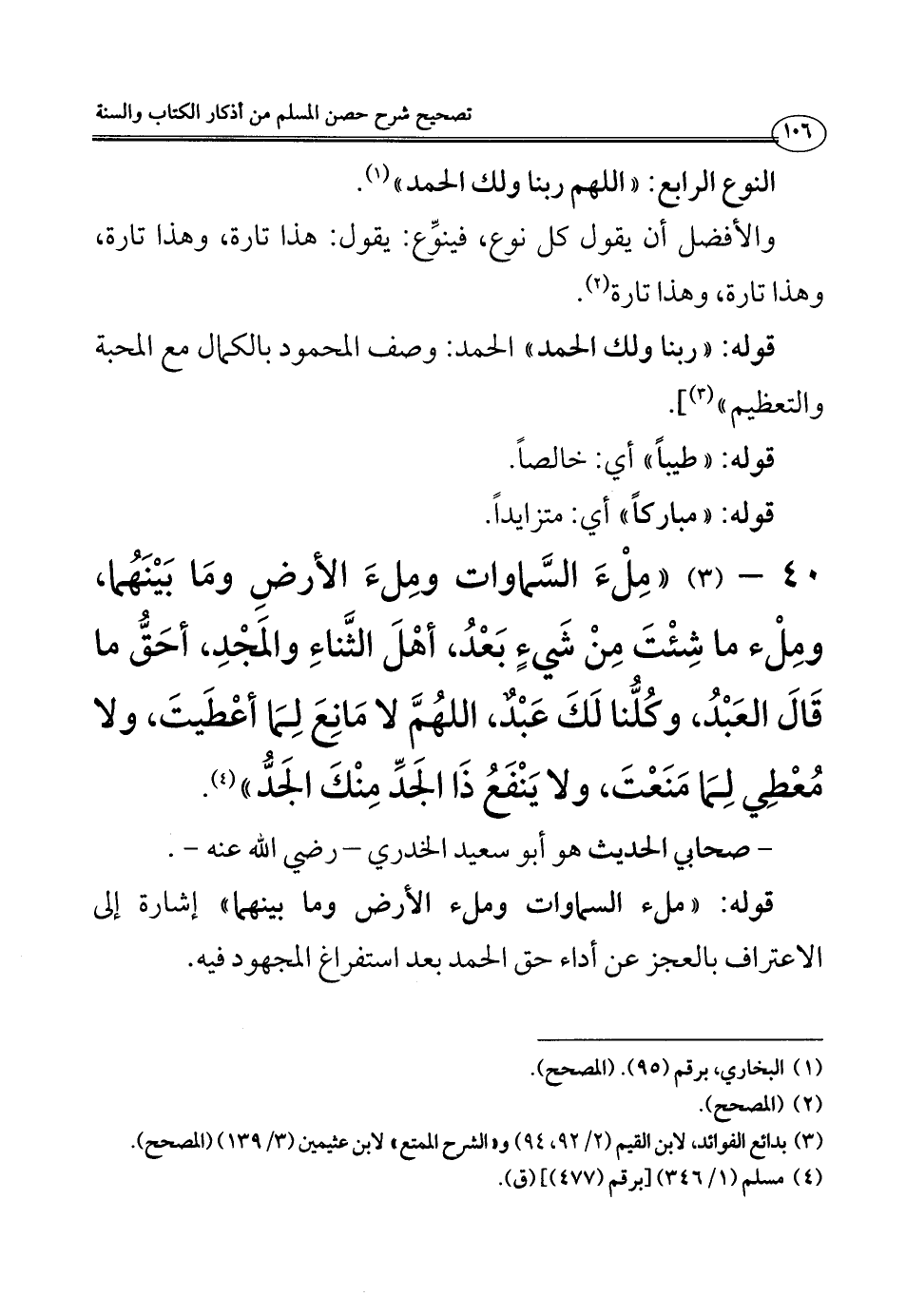 40 - (3) ((مِلْءَ السَّمَوَات ومِلءَ الأرضِ ومَا بَيْنَهُما، ومِلْء ما شِئْتَ مِنْ شَيءٍ بَعْدُ، أهْلَ الثَّناءِ والمَجْدِ، أحَقُّ ما قَالَ العَبْدُ، وكُلُّنا لَكَ عَبْدٌ، اللهُمَّ لا مَانِعَ لِمَا أعْطَيتَ، ولا مُعْطِي لِمَا مَنَعْتَ، ولا يَنْفَعُ ذَا الجَدِّ مِنْكَ الجَدُّ)) (¬4).