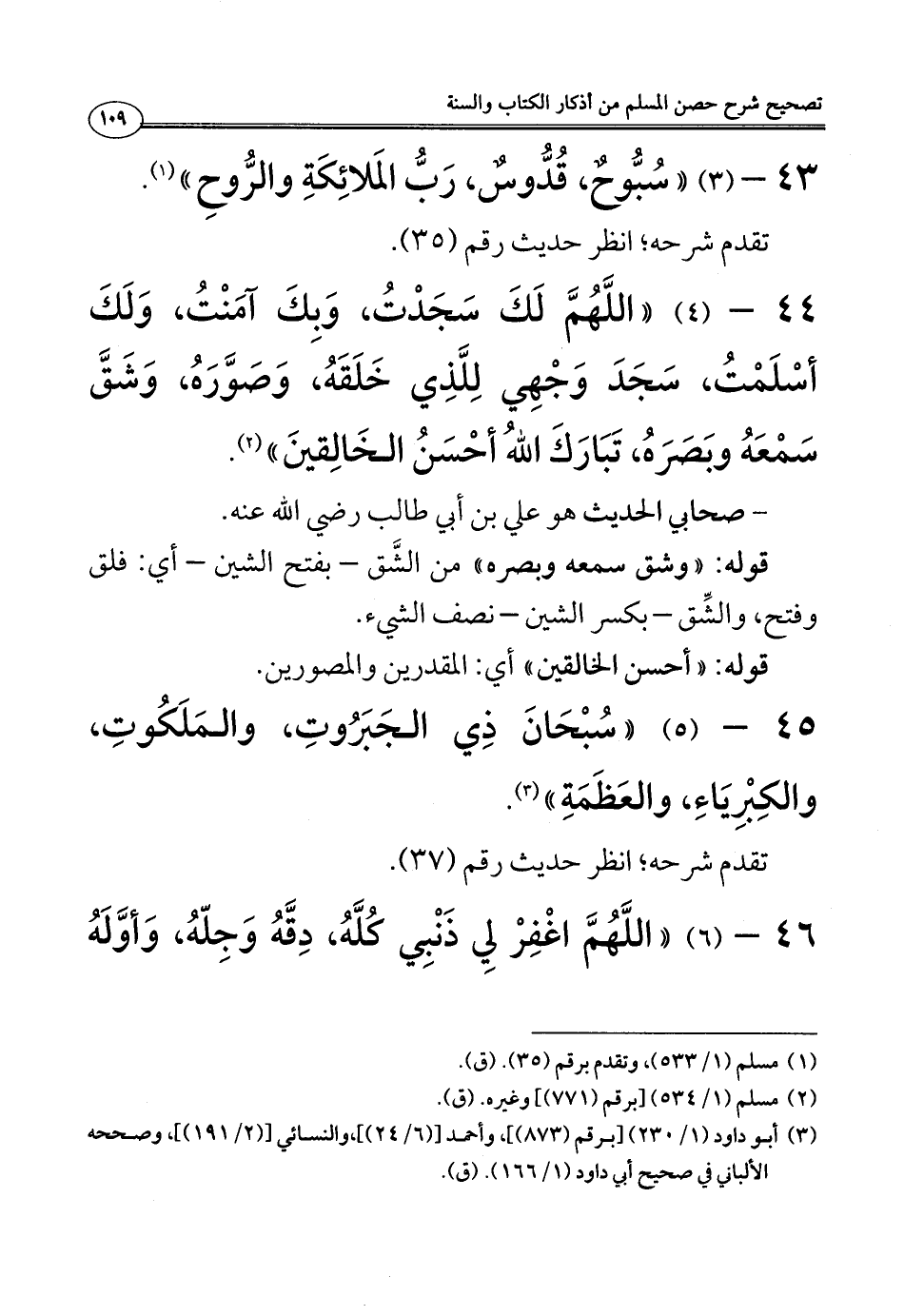 44 - (4) ((اللَّهُمَّ لَكَ سَجَدْتُ، وَبِكَ آمَنْتُ، وَلَكَ أسْلَمْتُ، سَجَدَ وَجْهِي لِلَّذِي خَلَقَهُ، وَصَوَّرَهُ، وَشَقَّ سَمْعَهُ وبَصَرَهُ، تَبَارَكَ اللَّهُ أحْسَنُ الخَالِقينَ)) (¬2).