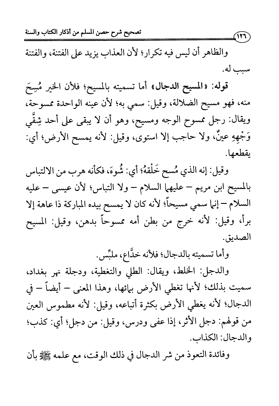 منه، فهو مسيح الضلالة، وقيل: سمي به؛ لأن عينه الواحدة ممسوحة، ويقال: رجل ممسوح الوجه ومسيح، وهو أن لا يبقى على أحد شِقَّي وَجْهِهِ عينٌ، ولا حاجب إلا استوى، وقيل: لأنه يمسح الأرض؛ أي: يقطعها.