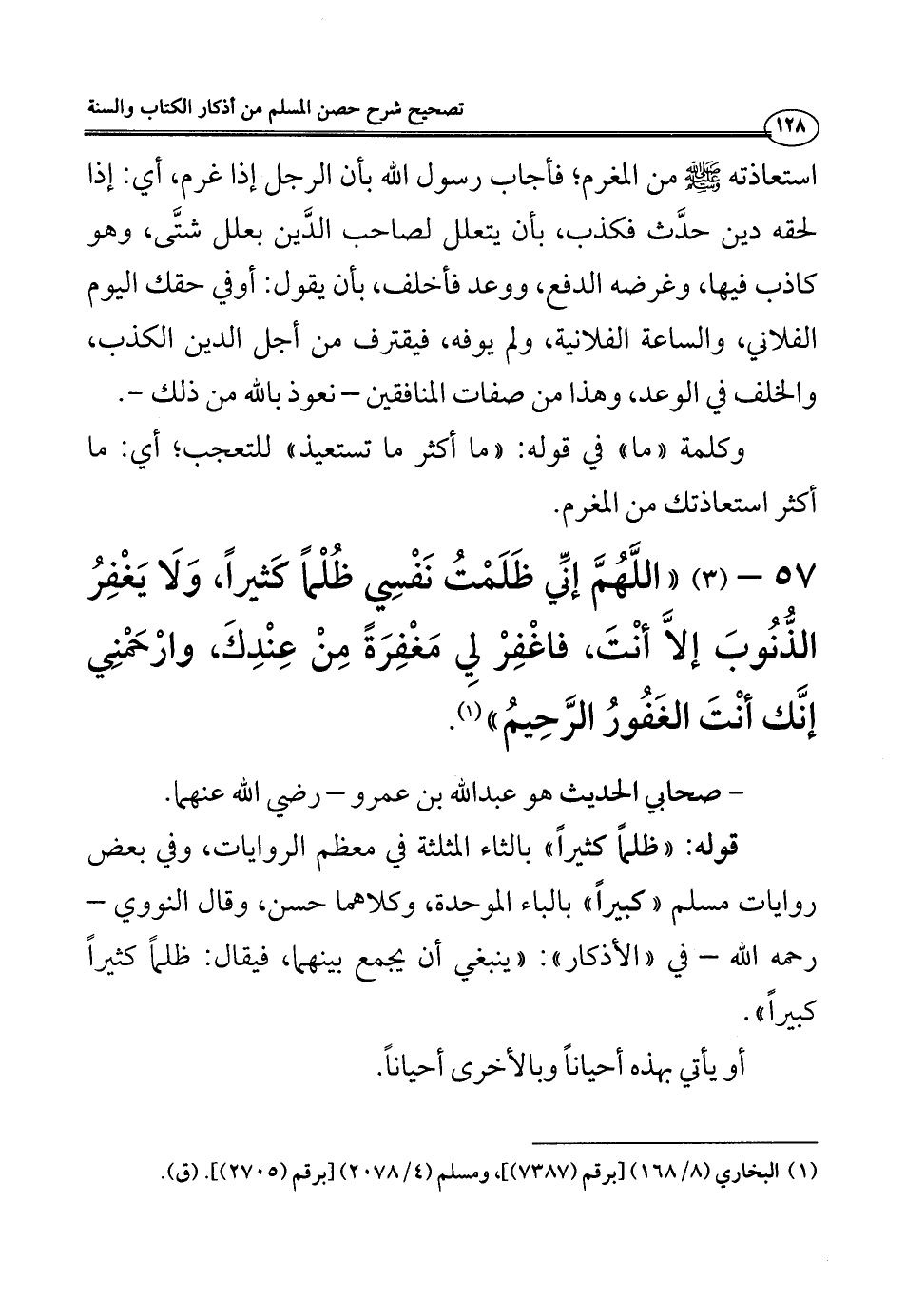 57 - (3) ((اللَّهُمَّ إنِّي ظَلَمْتُ نَفْسِي ظُلْماً كَثيراً، وَلَا يَغْفِرُ الذُّنُوبَ إلاَّ أنْتَ، فاغْفِرْ لِي مَغْفِرَةً مِنْ عِنْدِكَ، وارْحَمْنِي إنَّك أنْتَ الغَفُورُ الرَّحِيمُ)) (¬1).