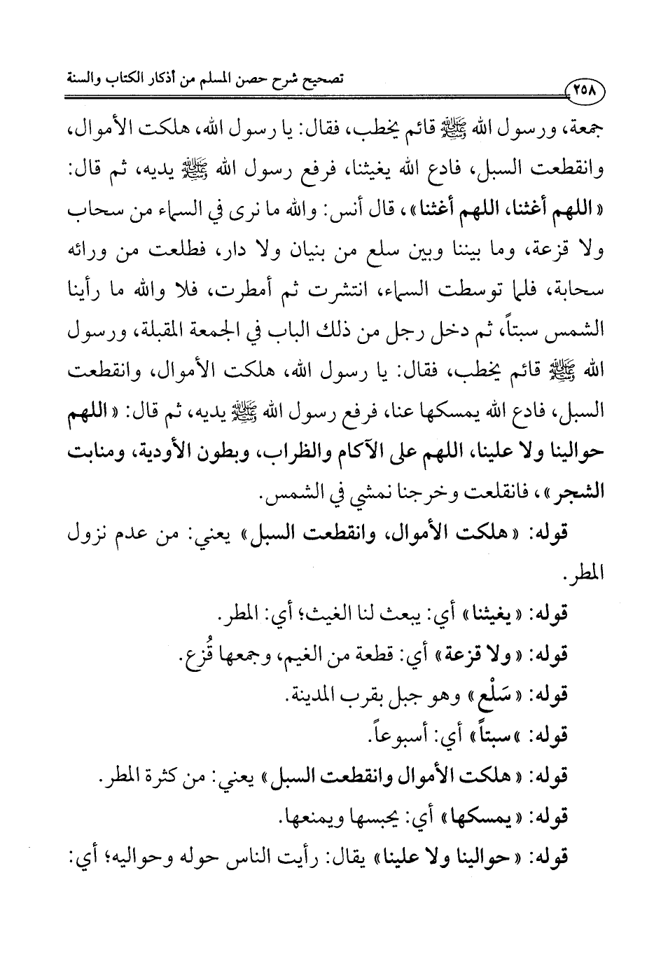 والحديث بتمامه؛ هو قوله - رضي الله عنه -: دخل رجل المسجد يوم جمعة، ورسول الله - صلى الله عليه وسلم - قائم يخطب، فقال: يا رسول الله، هلكت الأموال، وانقطعت السبل، فادع الله يغيثنا، فرفع رسول الله - صلى الله عليه وسلم - يديه، ثم قال: ((اللهم أغثنا، اللهم أغثنا))، قال أنس: والله ما نرى في السماء من سحاب ولا قزعة، وما بيننا وبين سلع من بنيان ولا دار، فطلعت من ورائه سحابة، فلما توسطت السماء، انتشرت ثم أمطرت، فلا والله ما رأينا الشمس سبتاً، ثم دخل رجل من ذلك الباب في الجمعة المقبلة، ورسول الله - صلى الله عليه وسلم - قائم يخطب، فقال: يا رسول الله، هلكت الأموال، وانقطعت السبل، فادع الله يمسكها عنا، فرفع رسول الله - صلى الله عليه وسلم - يديه، ثم قال: ((اللهم حوالينا ولا علينا، اللهم على الآكام والظراب، وبطون الأودية، ومنابت الشجر))، فانقلعت وخرجنا نمشي في الشمس.