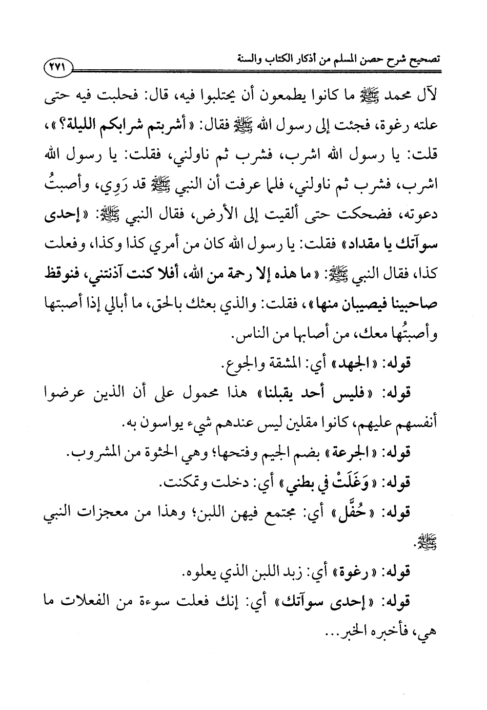 - صلى الله عليه وسلم - ما كانوا يطمعون أن يحتلبوا فيه، قال: فحلبت فيه حتى علته رغوة، فجئت إلى رسول الله فقال: ((أشربتم شرابكم الليلة؟))، قلت: يا رسول الله اشرب، فشرب ثم ناولني، فقلت: يا رسول الله اشرب، فشرب ثم ناولني، فلما عرفت أن النبي - صلى الله عليه وسلم - قد رَوِي، وأصبتُ دعوته، فضحكت حتى ألقيت إلى الأرض، فقال النبي - صلى الله عليه وسلم -: ((إحدى سوآتك يا مقداد)) فقلت: يا رسول الله كان من أمري كذا وكذا، وفعلت كذا، فقال النبي - صلى الله عليه وسلم -: ((ما هذه إلا رحمة من الله، أفلا كنت آذنتني، فنوقظ صاحبينا فيصيبان منها))، فقلت: والذي بعثك بالحق، ما أبالي إذا أصبتها وأصبتُها معك، من أصابها من الناس.