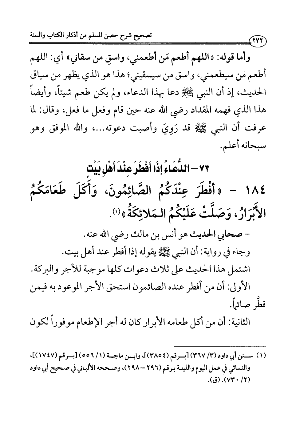 184 - ((أفْطَرَ عِنْدَكُمُ الصَّائِمُونَ، وَأَكَلَ طَعَامَكُمُ الأَبْرَارُ، وَصَلَّتْ عَلَيْكُمُ المَلائِكَةُ)) (¬1).