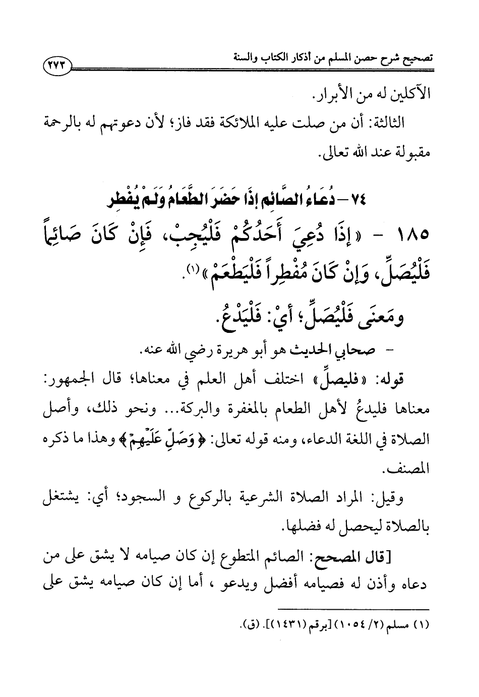 185 - ((إذَا دُعِيَ أَحَدُكُمْ فَلْيُجِبْ، فَإِنْ كَانَ صَائِماً فَلْيُصَلِّ، وَإنْ كَانَ مُفْطِراً فَلْيَطْعَمْ)) (¬1).
