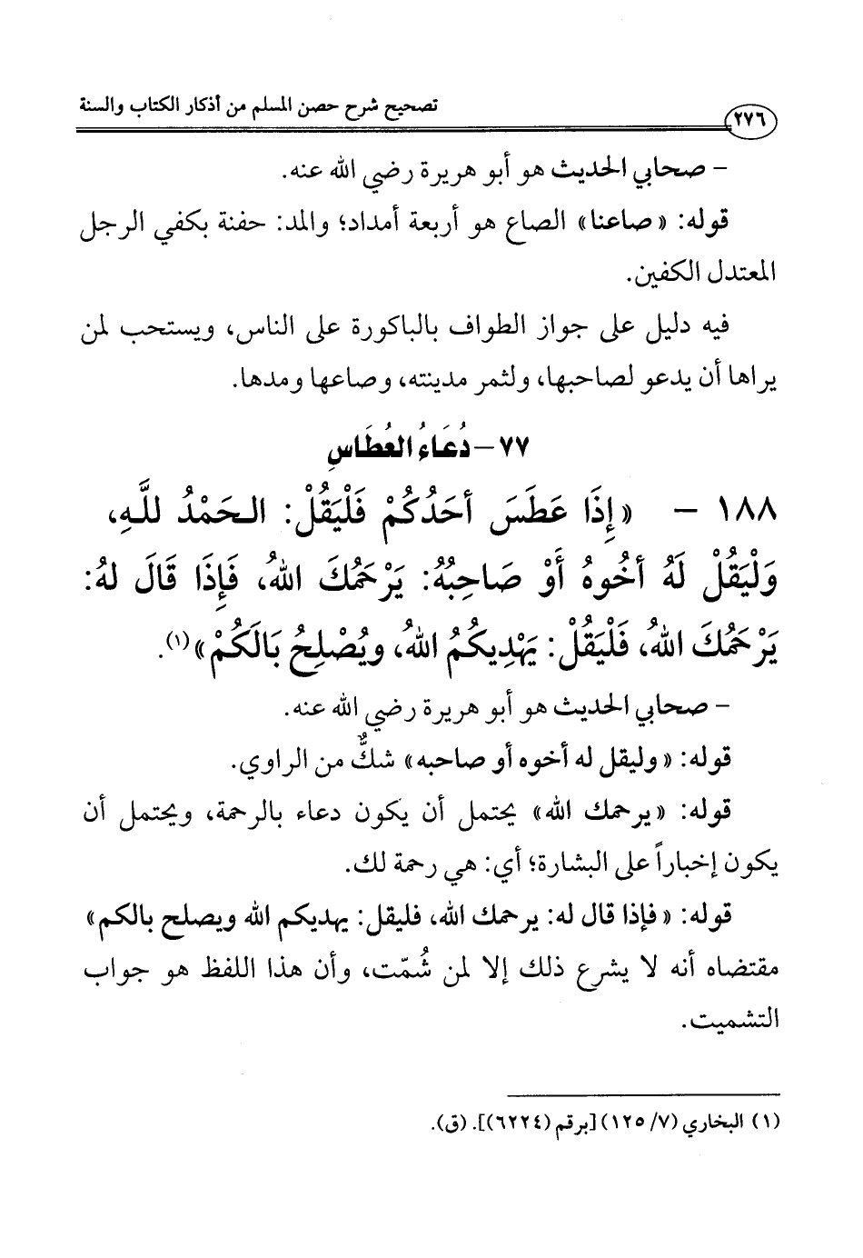 188 - ((إِذَا عَطَسَ أحَدُكُمْ فَلْيَقُلْ: الحَمْدُ للَّهِ، وَلْيَقُلْ لَهُ أخُوهُ أَوْ صَاحِبُهُ: يَرْحَمُكَ اللَّهُ، فَإِذَا قَالَ لهُ: يَرْحَمُكَ اللَّهُ، فَلْيَقُلْ: يَهْدِيكُمُ اللَّهُ، ويُصْلِحُ بَالَكُمْ)) (¬1).