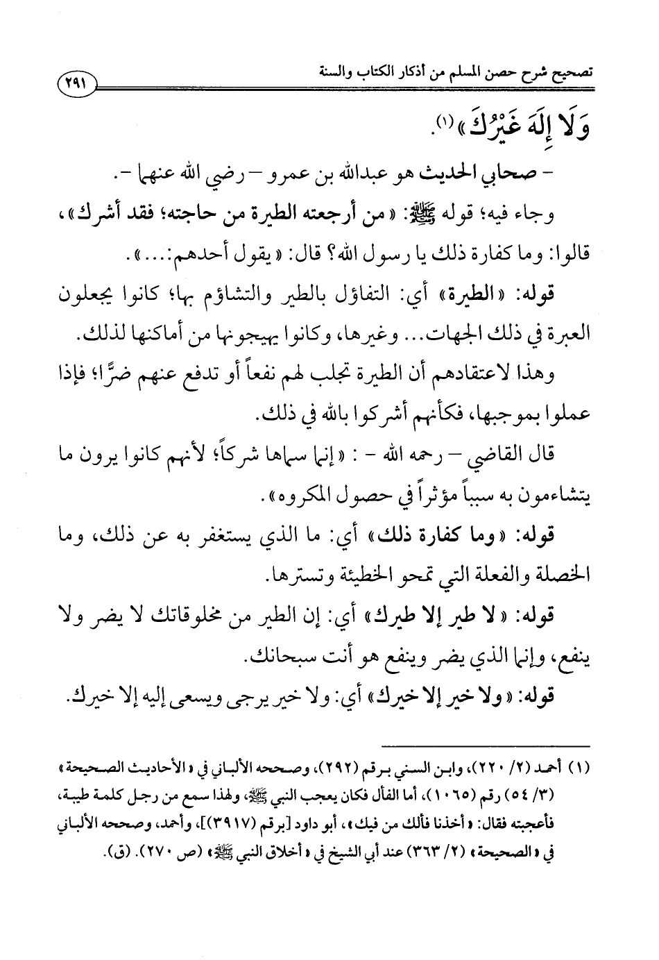 وجاء فيه؛ قوله - صلى الله عليه وسلم -: ((من أرجعته الطيرة من حاجته؛ فقد أشرك))، قالوا: وما كفارة ذلك يا رسول الله؟ قال: ((يقول أحدهم: ... )).