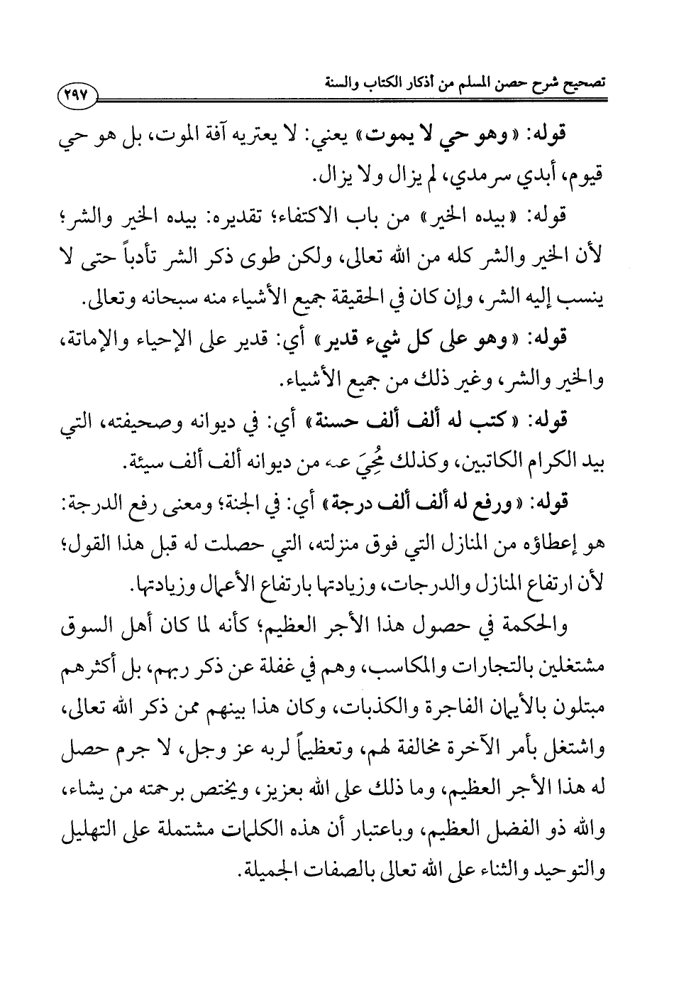 والحكمة في حصول هذا الأجر العظيم؛ كأنه لما كان أهل السوق مشتغلين بالتجارات والمكاسب، وهم في غفلة عن ذكر ربهم، بل أكثرهم مبتلون بالأيمان الفاجرة والكذبات، وكان هذا بينهم ممن ذكر الله تعالى، واشتغل بأمر الآخرة مخالفة لهم، وتعظيماً لربه - عز وجل -، لا جرم حصل له هذا الأجر العظيم، وما ذلك على الله بعزيز، ويختص برحمته من يشاء، والله ذو الفضل العظيم، وباعتبار أن هذه الكلمات مشتملة على التهليل والتوحيد والثناء على الله تعالى بالصفات الجميلة.