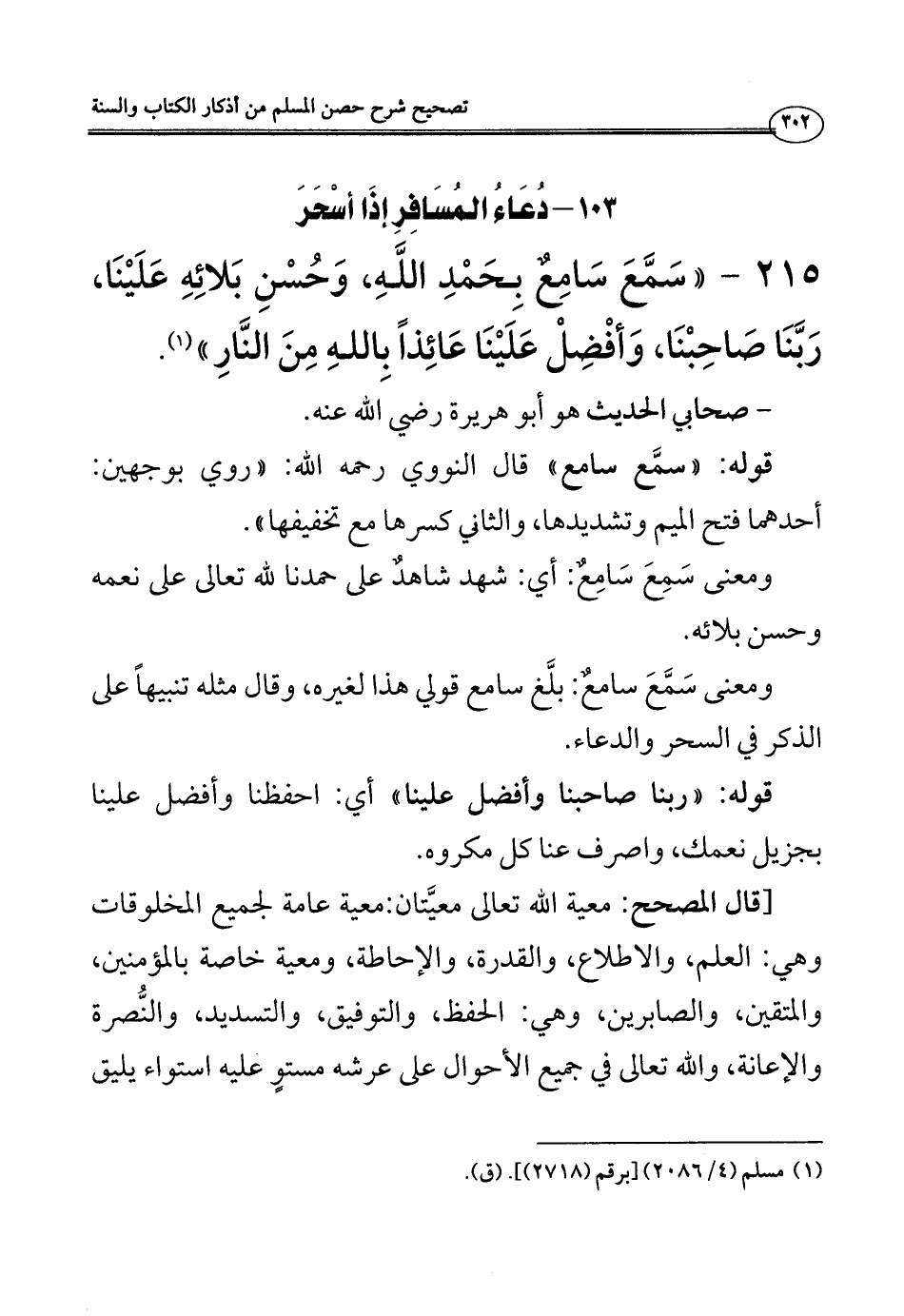 215 - ((سَمَّعَ سَامِعٌ بِحَمْدِ اللَّهِ، وَحُسْنِ بَلائِهِ عَلَيْنَا، رَبَّنَا صَاحِبْنَا، وَأفْضِلْ عَلَيْنَا عَائِذاً بِاللهِ مِنَ النَّارِ)) (¬1).