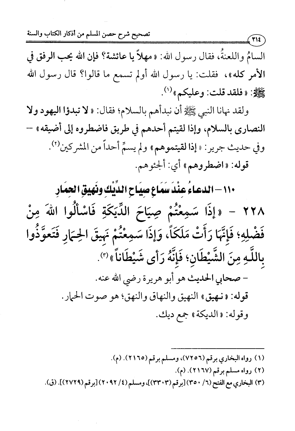 228 - ((إذَا سَمِعْتُمْ صِيَاحَ الدِّيَكَةِ فَاسْألُوا اللهَ مِنْ فَضْلِهِ؛ فَإِنَّهَا رَأَتْ مَلَكَاً، وَإذَا سَمِعْتُمْ نَهِيقَ الحِمَارِ فَتَعوَّذُوا بِاللَّهِ مِنَ الشَّيْطَانِ؛ فَإِنَّهُ رَأى شَيْطَاناً)) (¬3).