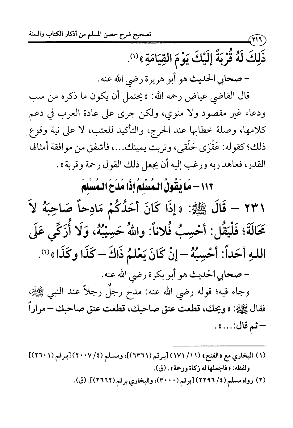 231 - قَالَ - صلى الله عليه وسلم -: ((إذَا كَانَ أحَدُكُمْ مَادِحاً صَاحِبَهُ لاَ مَحَالَةَ؛ فَلْيَقُل: أحْسِبُ فُلاناً: واللهُ حَسِيْبُهُ، وَلَا أُزَكِّي عَلَى اللهِ أحَداً: أحْسِبُهُ - إنْ كَانَ يَعْلمُ ذَاكَ - كَذَا وكَذَا)) (¬2).
