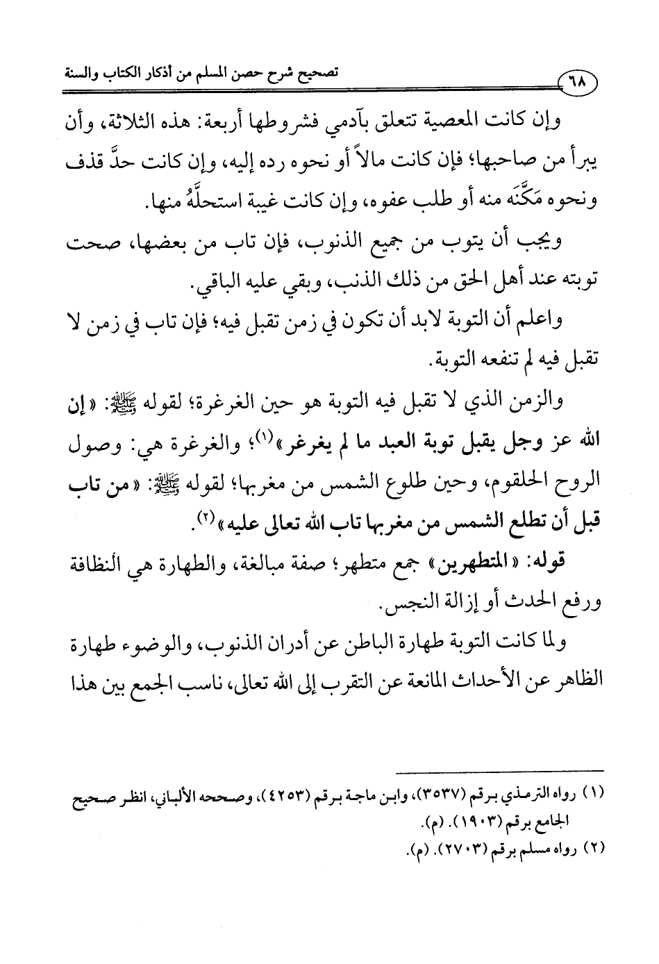 وإن كانت المعصية تتعلق بآدمي فشروطها أربعة: هذه الثلاثة، وأن يبرأ من صاحبها؛ فإن كانت مالاً أو نحوه رده إليه، وإن كانت حدَّ قذف ونحوه مَكَّنَه منه أو طلب عفوه، وإن كانت غيبة استحلَّهُ منها.