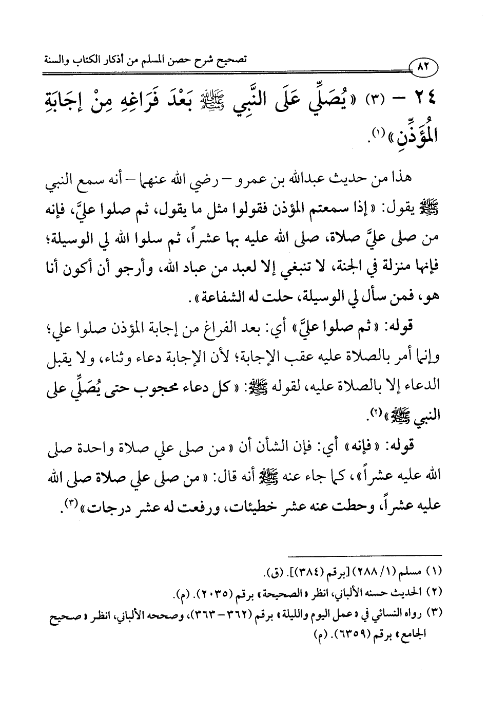 24 - (3) ((يُصَلِّي عَلَى النَّبِي - صلى الله عليه وسلم - بَعْدَ فَرَاغِهِ مِنْ إجَابَةِ المُؤَذِّنِ)) (¬1).