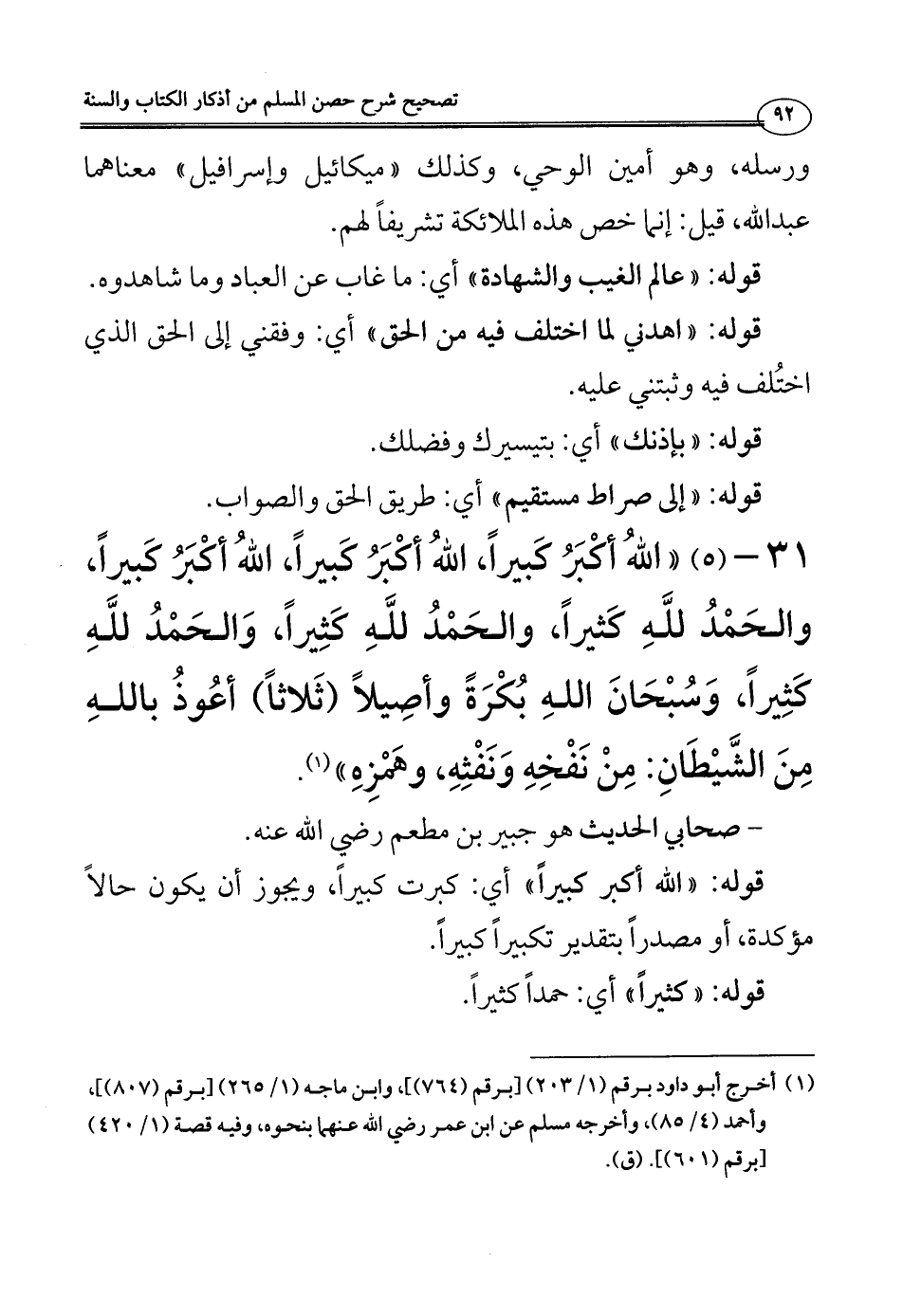 31 - (5) ((اللهُ أكْبَرُ كَبيراً، اللهُ أكْبَرُ كَبيراً، اللهُ أكْبَرُ كَبيراً، والحَمْدُ للَّهِ كَثيراً، والحَمْدُ للَّهِ كَثِيراً، وَالحَمْدُ للَّهِ كَثِيراً، وَسُبْحَانَ اللَّهِ بُكْرَةً وأصِيلاً (ثَلاثاً) أعُوذُ با للَّهِ مِنَ الشَّيْطَانِ: مِنْ نَفْحِهِ وَنَفْثِهِ، وهَمْزِهِ)) (¬1).