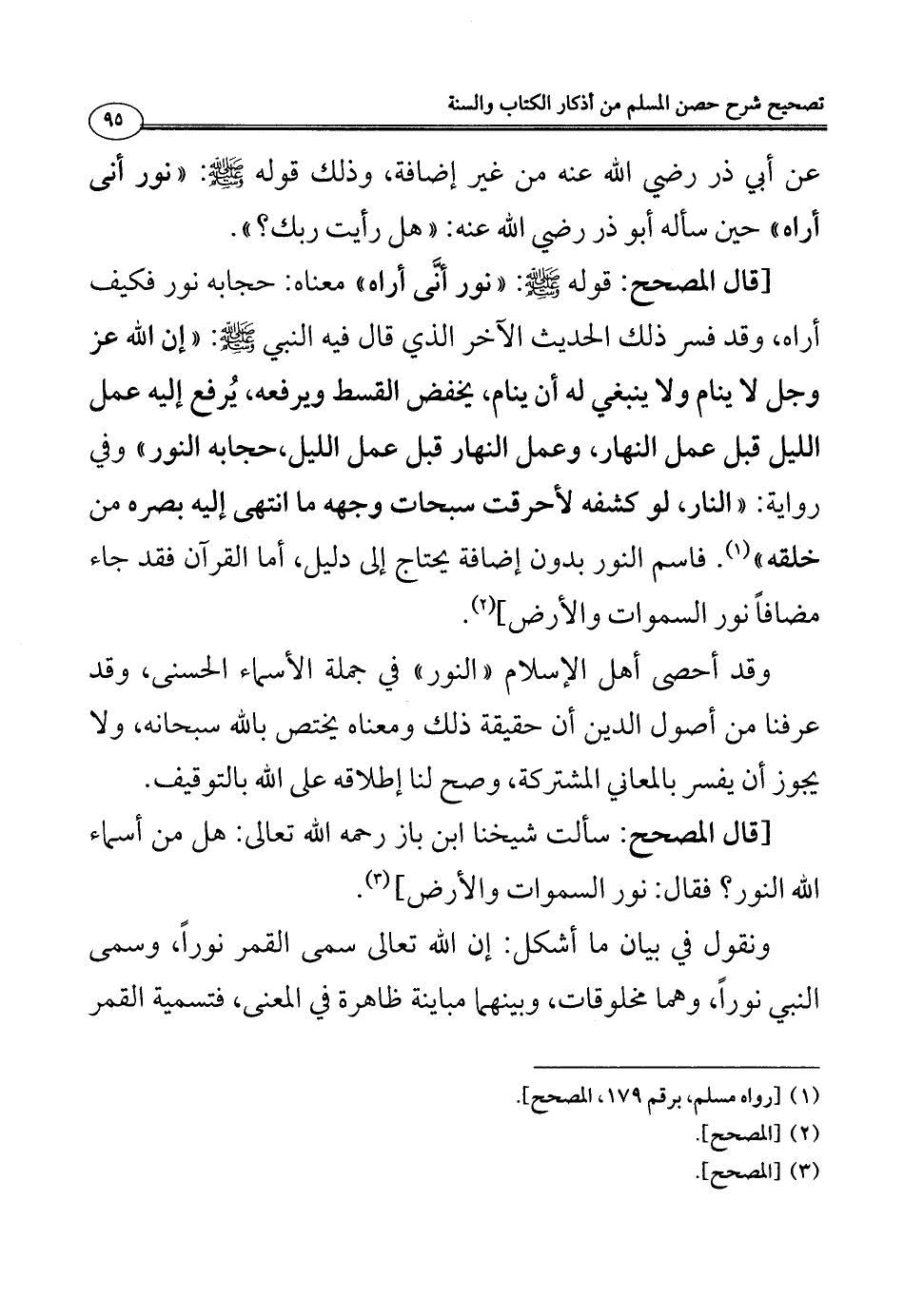 [قال المصحح: قوله - صلى الله عليه وسلم -: ((نور أنَّى أراه)) معناه: حجابه نور فكيف أراه، وقد فسر ذلك الحديث الآخر الذي قال فيه النبي - صلى الله عليه وسلم -: ((إن الله - عز وجل - لا ينام ولا ينبغي له أن ينام، يخفض القسط ويرفعه، يُرفع إليه عمل الليل قبل عمل النهار، وعمل النهار قبل عمل الليل، حجابه النور)) وفي رواية: ((النار، لو كشفه لأحرقت سبحات وجهه ما انتهى إليه بصره من خلقه)) (¬1). فاسم النور بدون إضافة يحتاج إلى دليل، أما القرآن فقد جاء مضافاً نور السموات والأرض] (¬2).